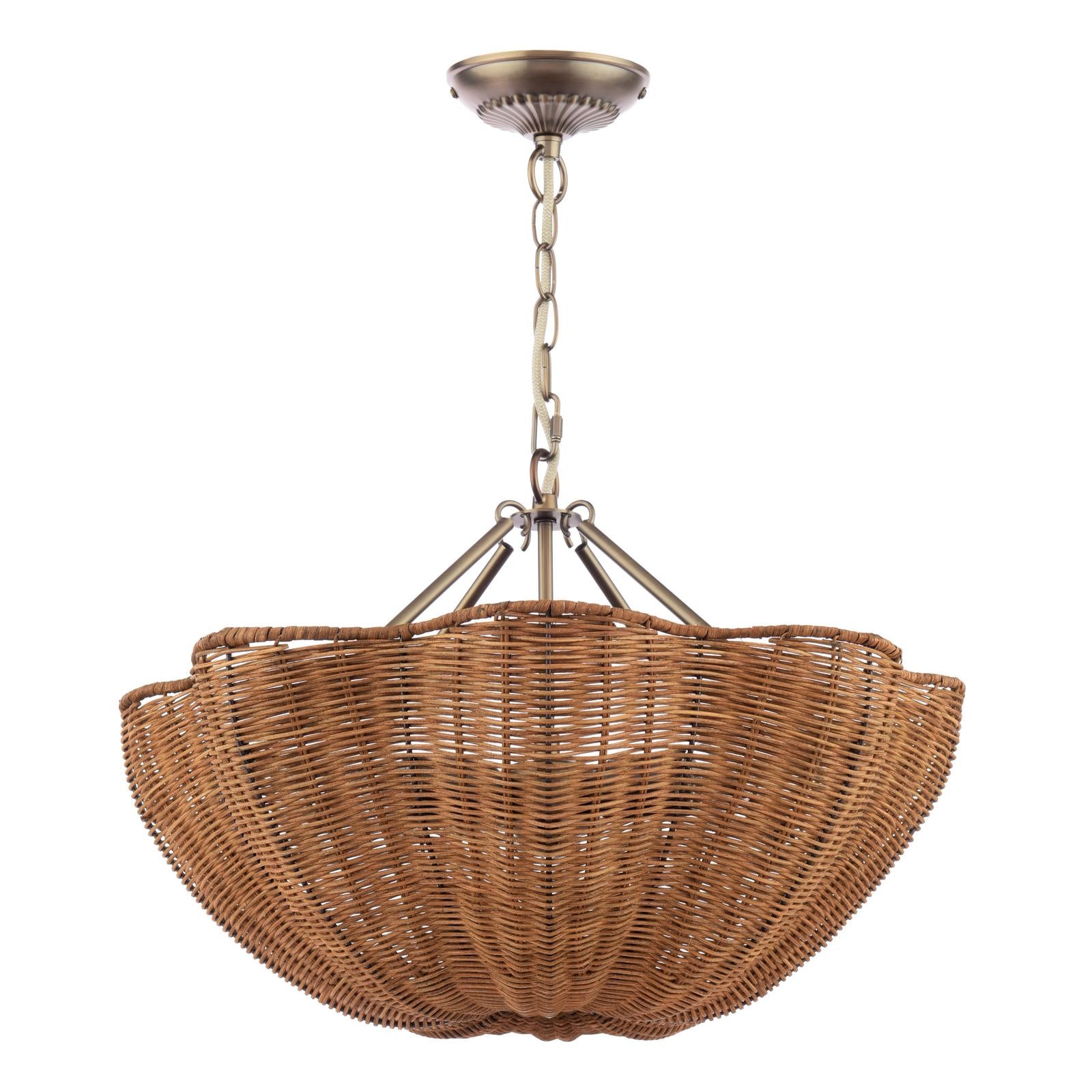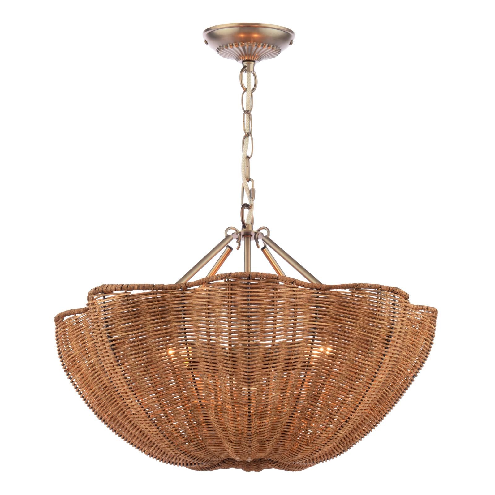 Beautiful contemporary interpretation of the chandelier in an antique brass plated finish. Decorative clear glass rods diffuse the light to create an inviting ambience.
