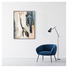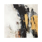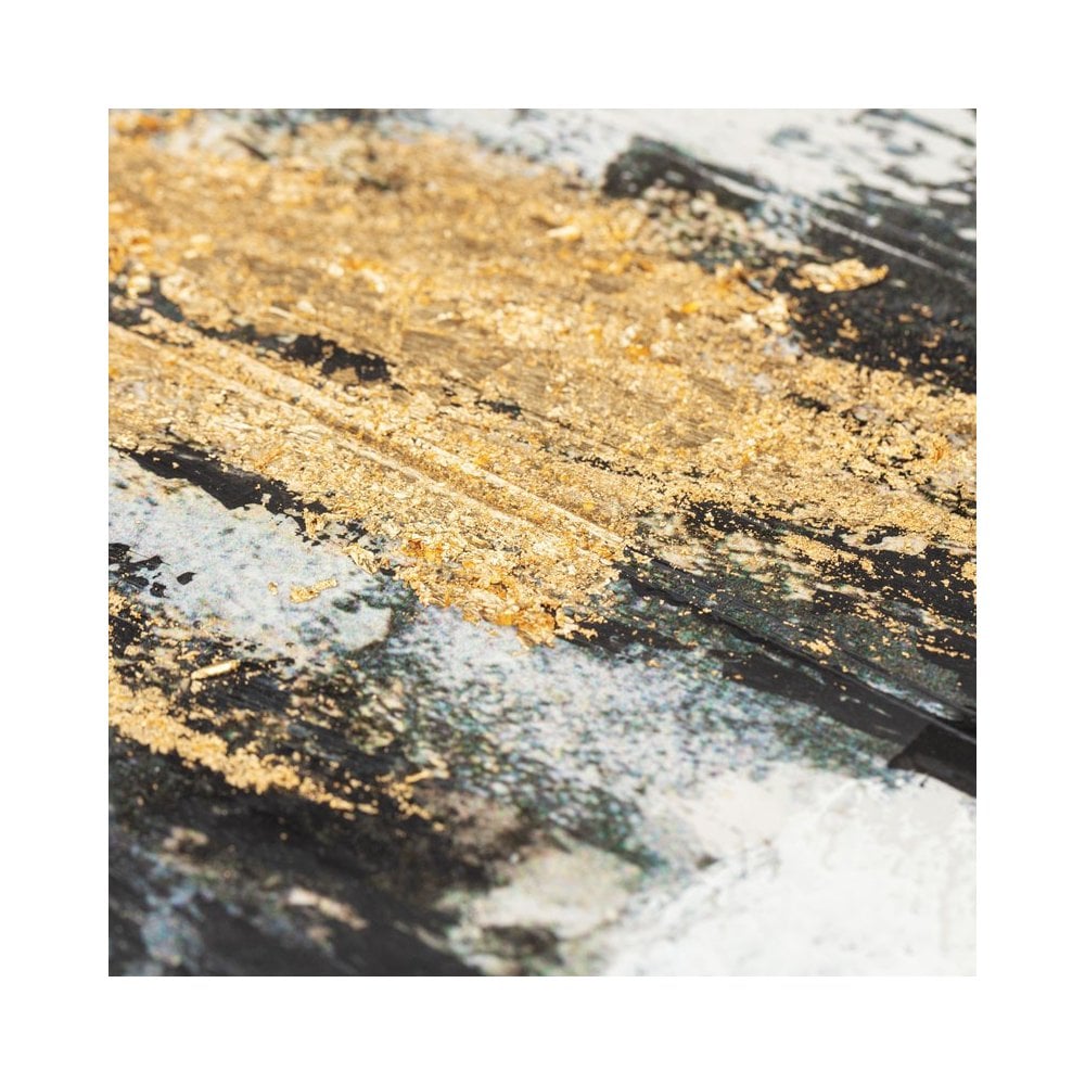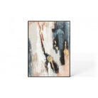 Large rectangular abstract painting with tones of Blacks, Blues, Golds & Neutrals.
