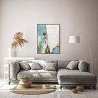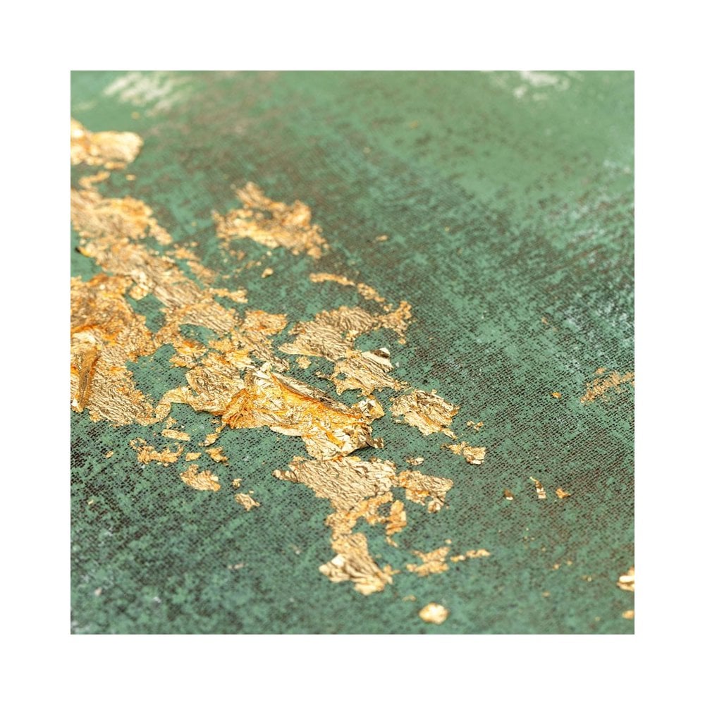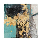 Large abstract painting with accents of Blue, Neutral, Green & Gold.