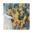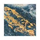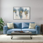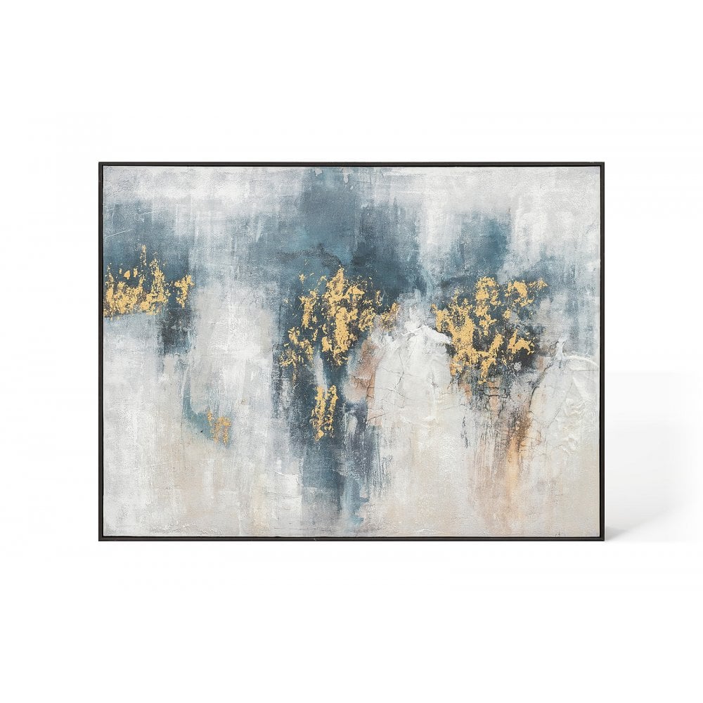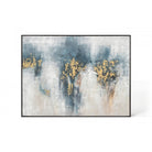 Large abstract painting with tones of Blue and Gold Foil complete with black frame.