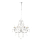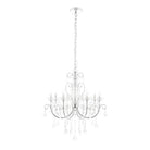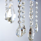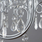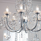 The Tabitha 8 light pendant fitting is finished in a chrome effect plate with clear crystal glass detail and droplets. IP44 rated so suitable for use in the bathroom, dimmable and suitable for use with LED lamps. Matching items available.