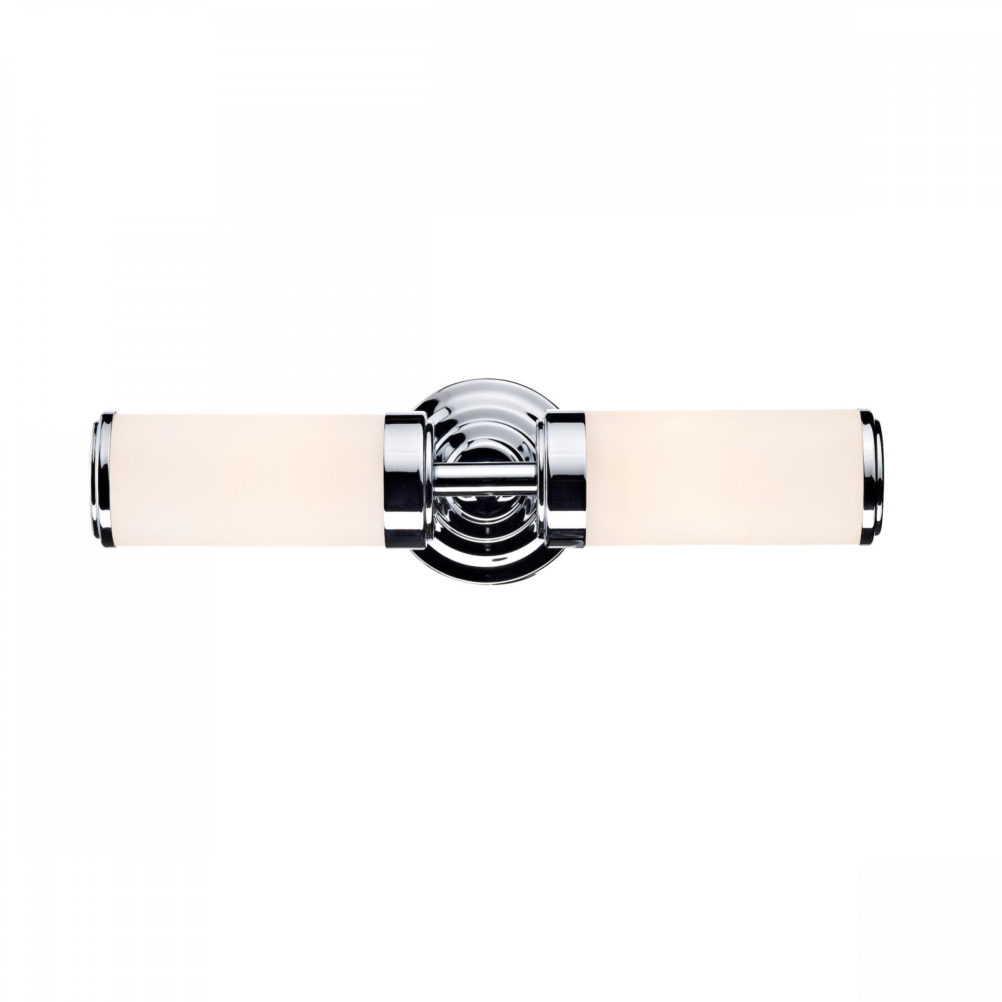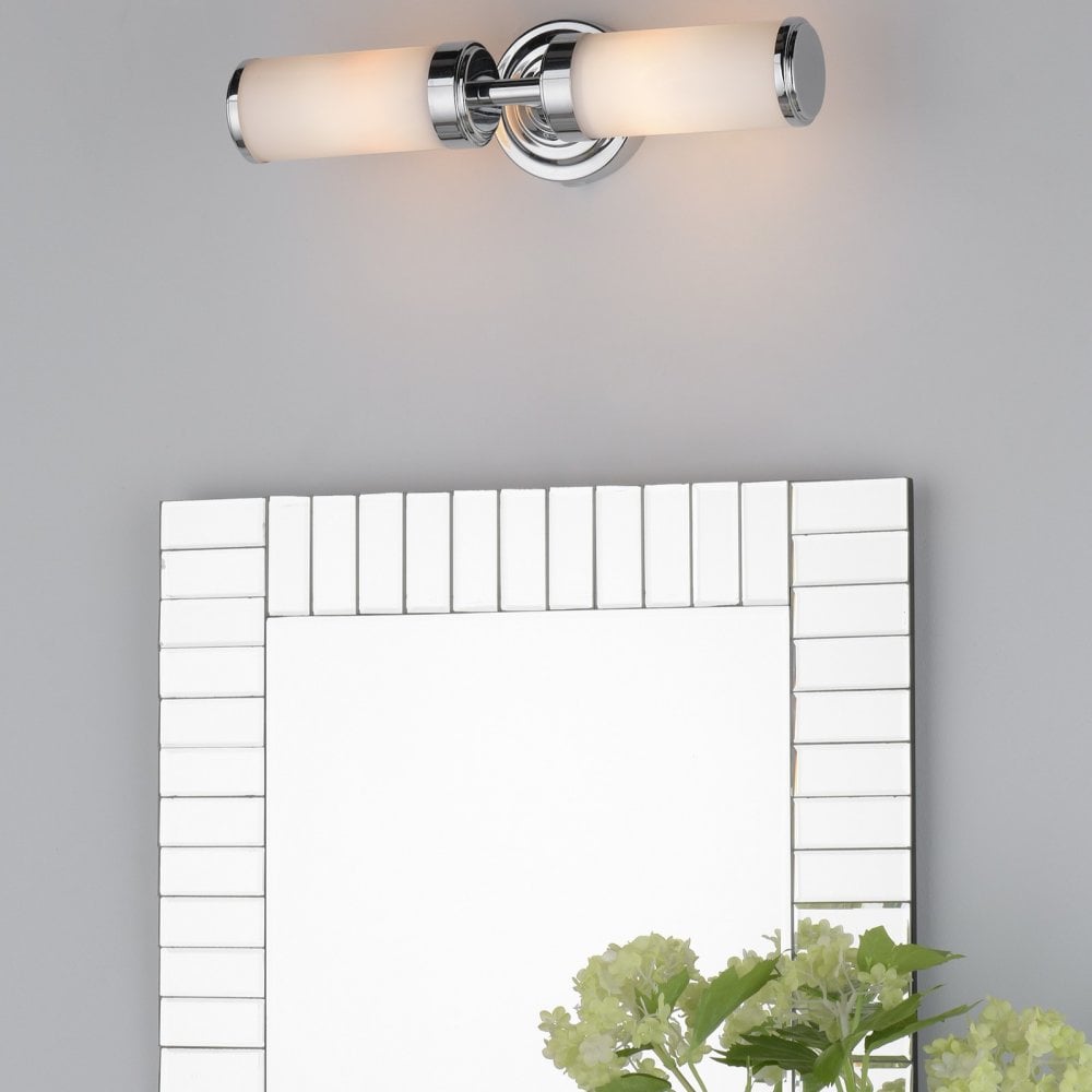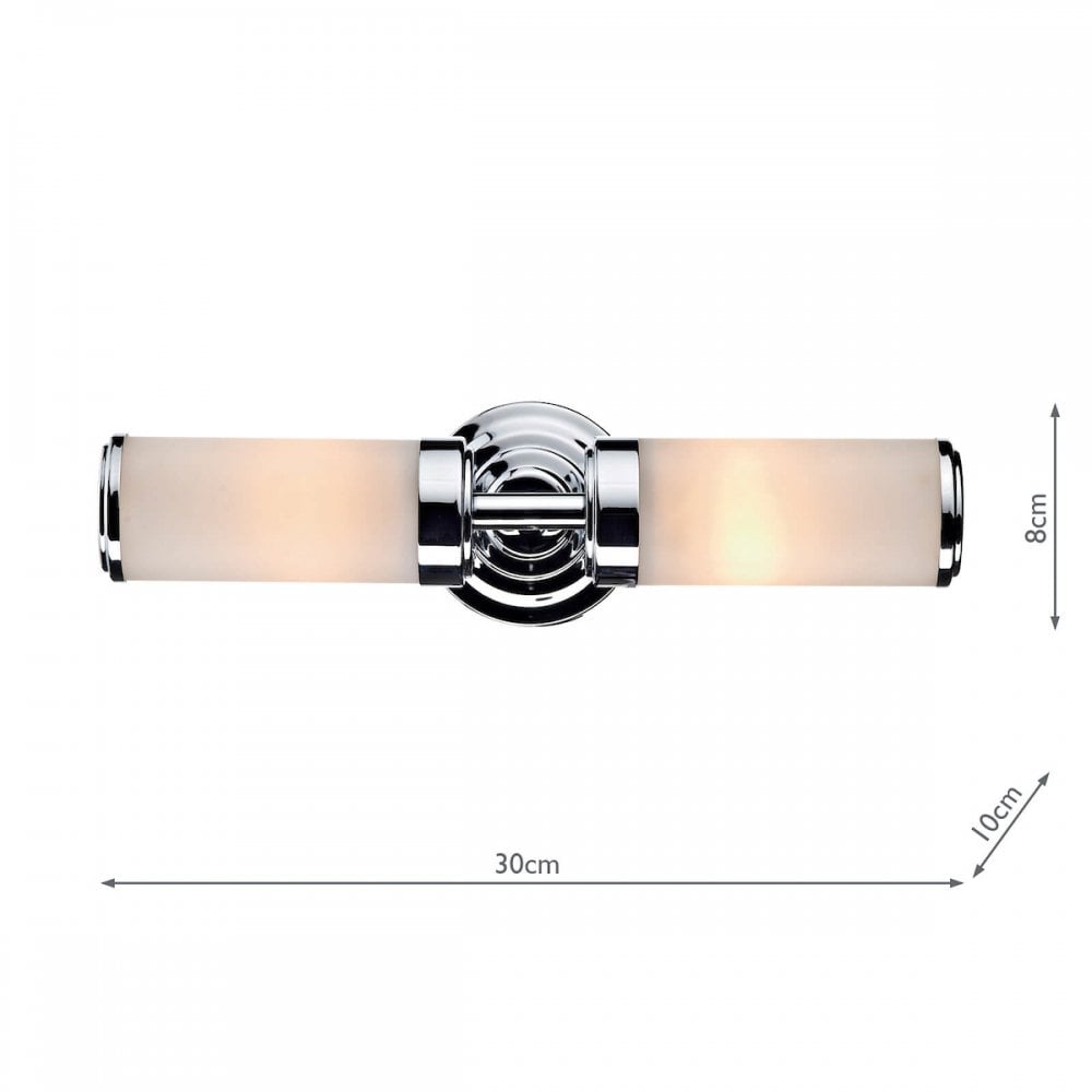 The Century IP44 2lt Bathroom Wall Light has a ribbed polished chrome backplate and frosted glass shades. The wall light is pull cord switched.