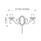 A twin wall light with scrolled arms in antique brass effect finish with pull switch. suitable for use with LED lamps and dimmable. Matching items available.