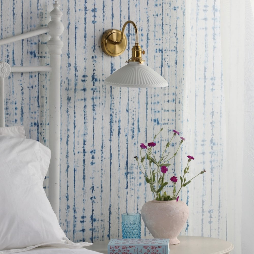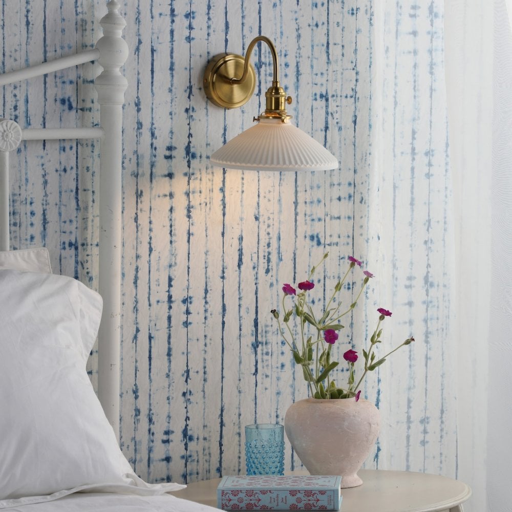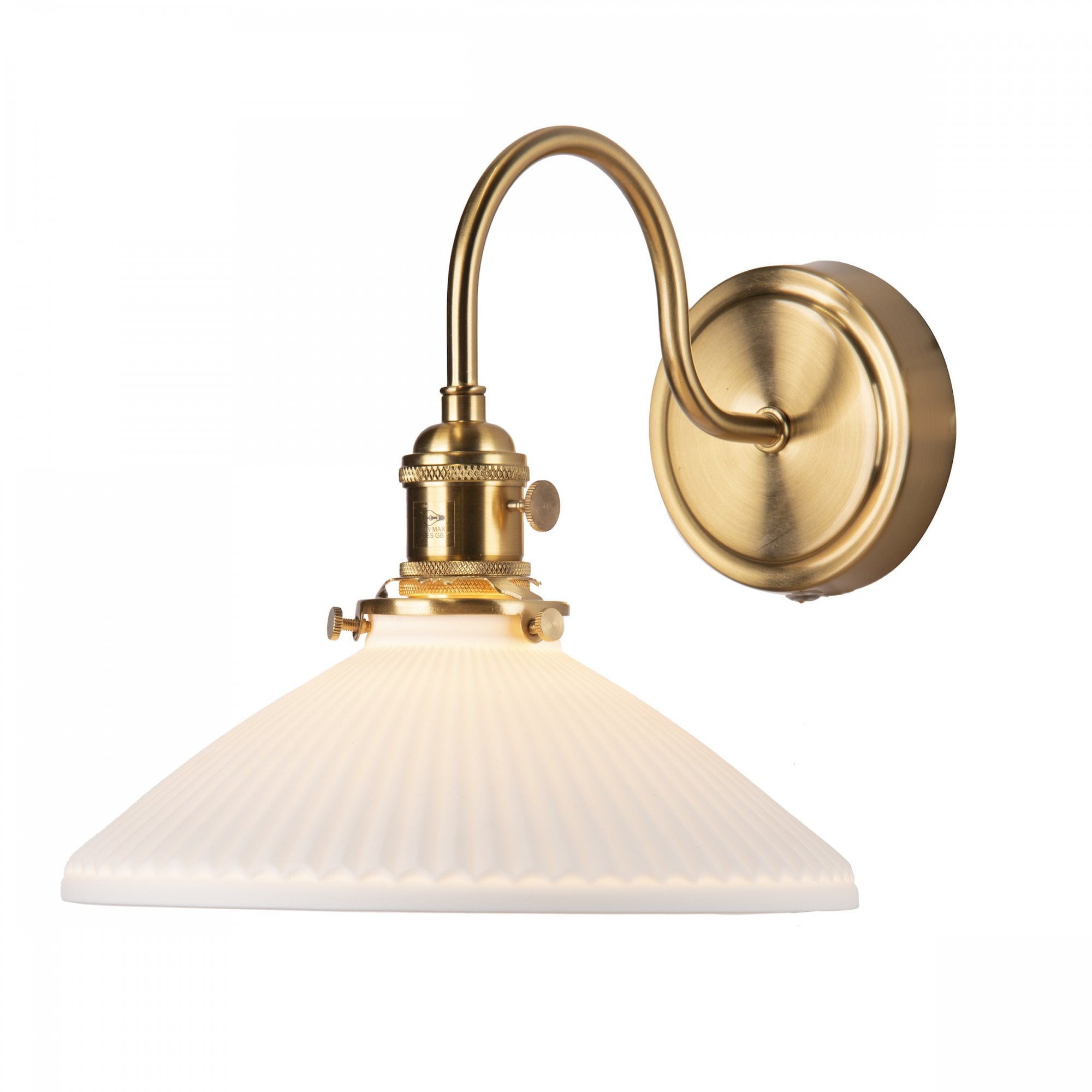 The Hadano Wall Light Natural Brass & Ceramic Shallow Shade is a beautiful wall light with a fine ribbed white ceramic shade and natural brass frame. When lit, the shade gives off a lovely warm glow that complements any decor. The pull cord switch is hidden behind the fixture, allowing you to turn the light on and off with ease. The Hadano wall light is designed to complement any room in your home, from kitchen to living room or dining room. Its vintage farmhouse look is achieved with a combination of natural brass and white ceramic.