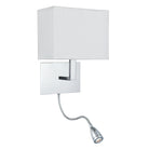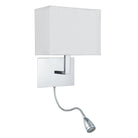 The stylish Hotel LED fitting has a chrome finish wall plate with a right angled arm and a slim white oblong shade, with a light Controlled by a handy rocker switch. But it also has an innovative flexi-arm torch that uses the latest energy saving LED technology to shine the light wherever you please. LED's use up to 75% less energy and last up to 20 times longer than incandescent bulbs.