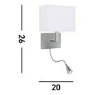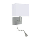 The Hotel wall fitting adds a contemporary look to any wall. The stylish fitting has a satin silver finish wall plate with a right angled arm and a slim white oblong shade, with a light Controlled by a handy rocker switch. But it also has an innovative flexi-arm torch that uses the latest energy saving LED technology to shine the light wherever you please.