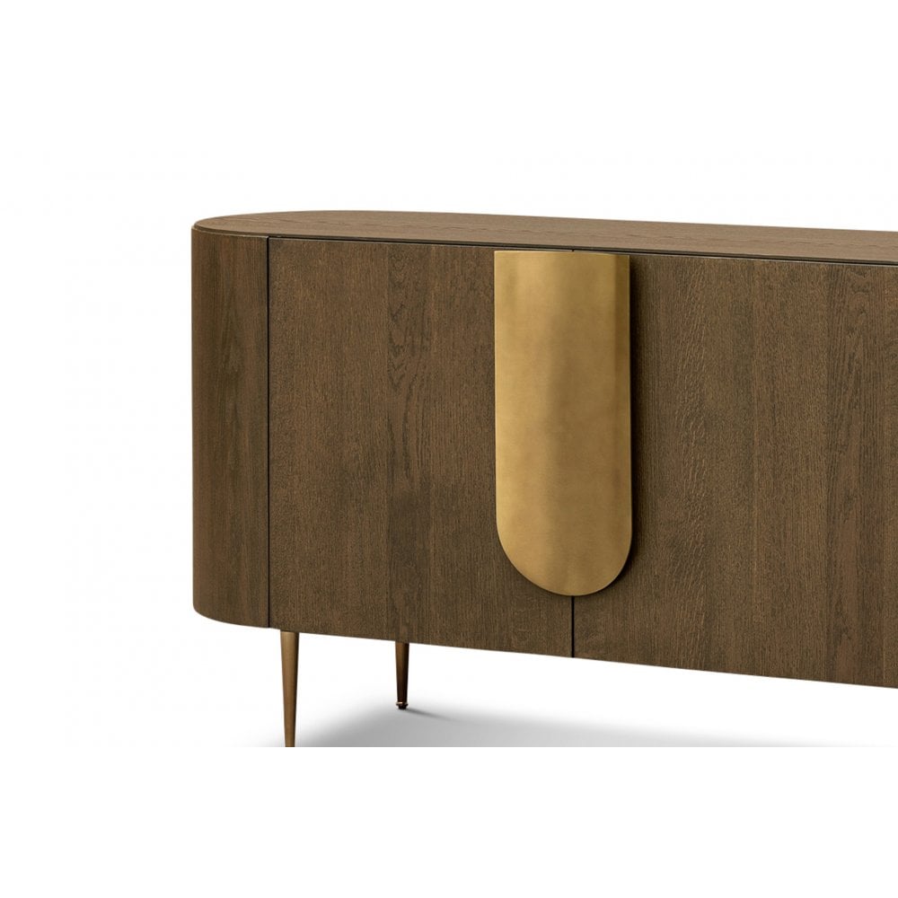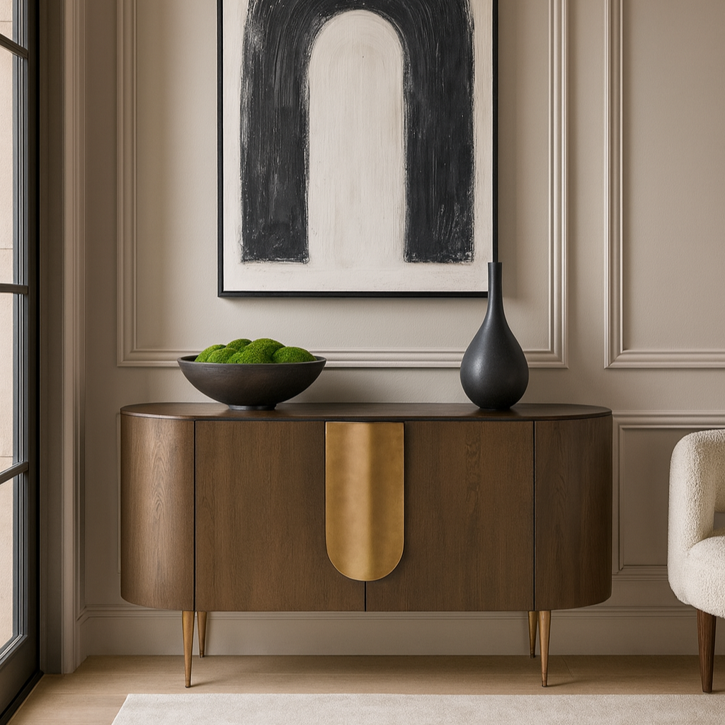 The Napa Sideboard has 2 doors and comes in a textured caramel oak veneer with bronze handles. With its curved and unique design, the Napa Sideboard can help achieve the perfect finish in any home or interior design project.