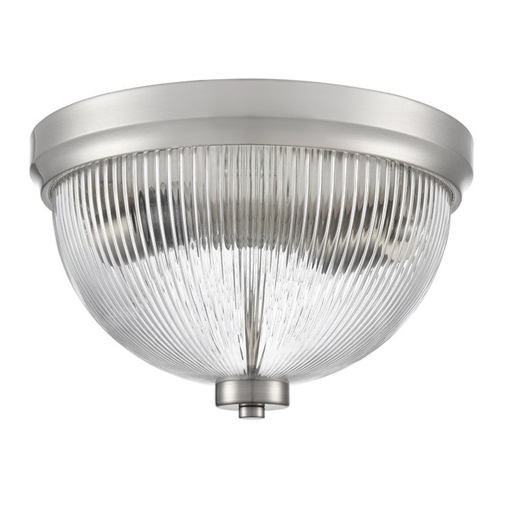 Small satin nickel finish flush ceiling fitting with clear ribbed glass