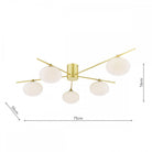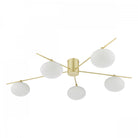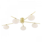 The Jasper 5 Light Semi-Flush Satin Gold and Opal Glass is a mid-century inspired contemporary flush ceiling light with fine arms and opal swirl glass perching on top. The Jasper semi-flush features a satin gold finish with opal glass shades for a look that is both contemporary and cosy. The Jasper semi-flush is suitable for an entryway, dining room or anywhere a little style is needed.
