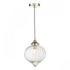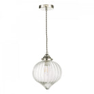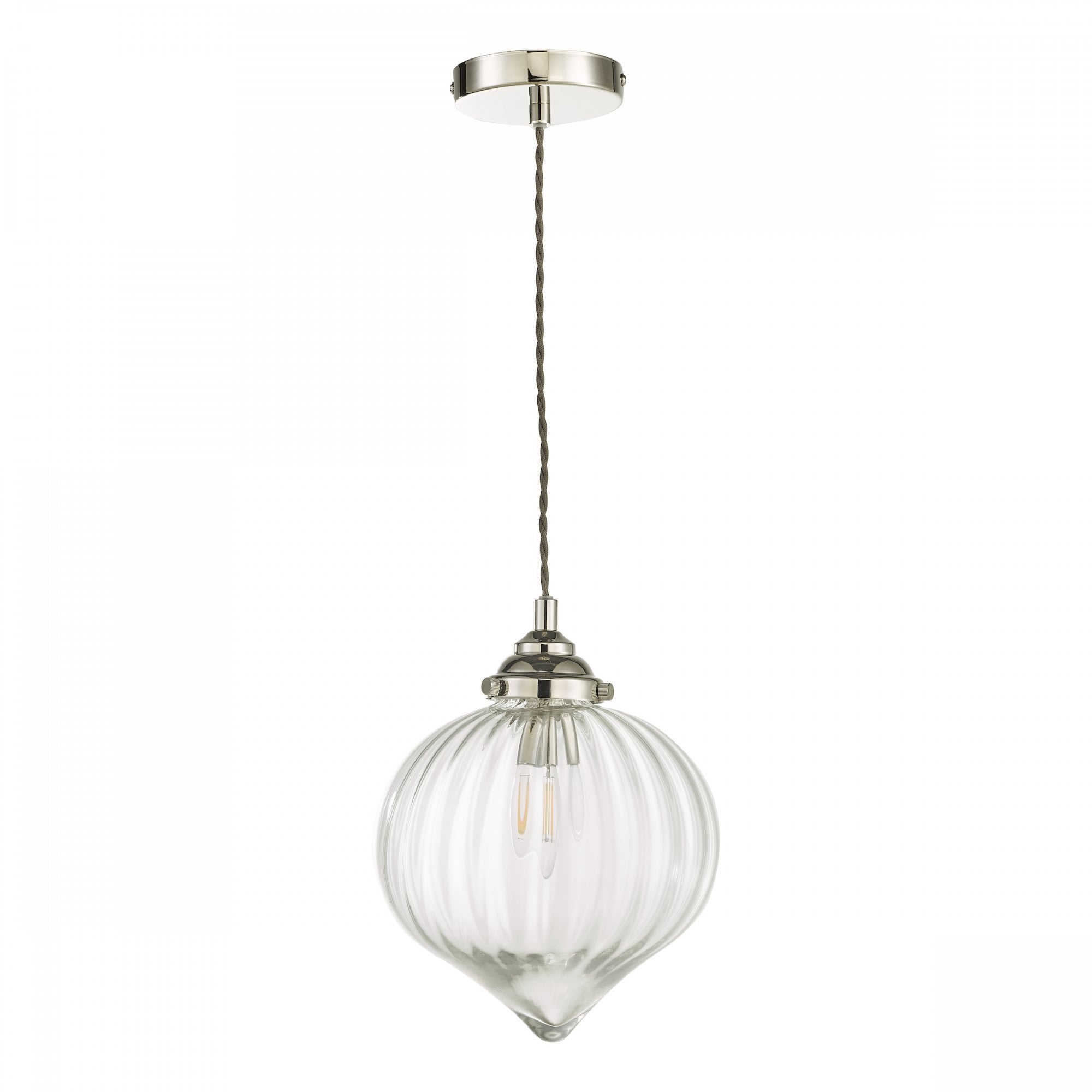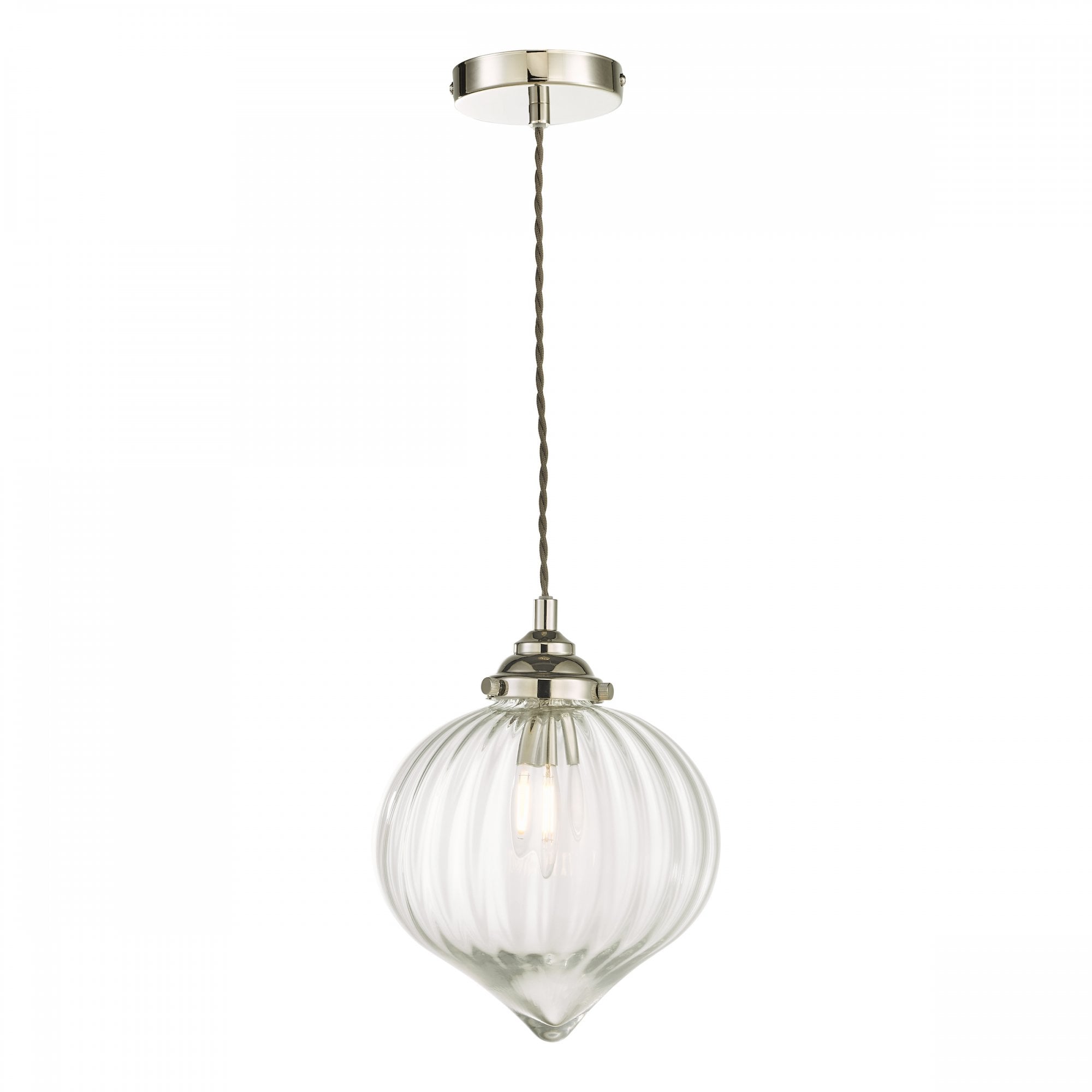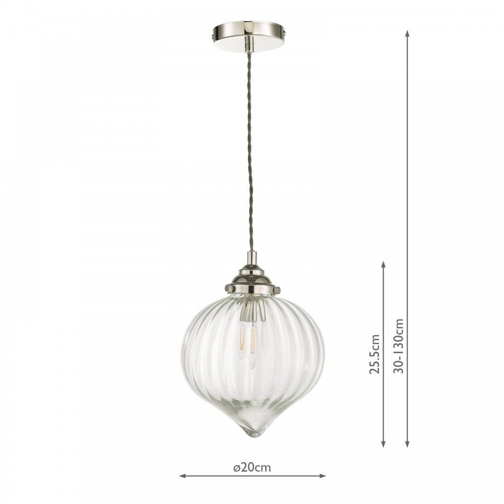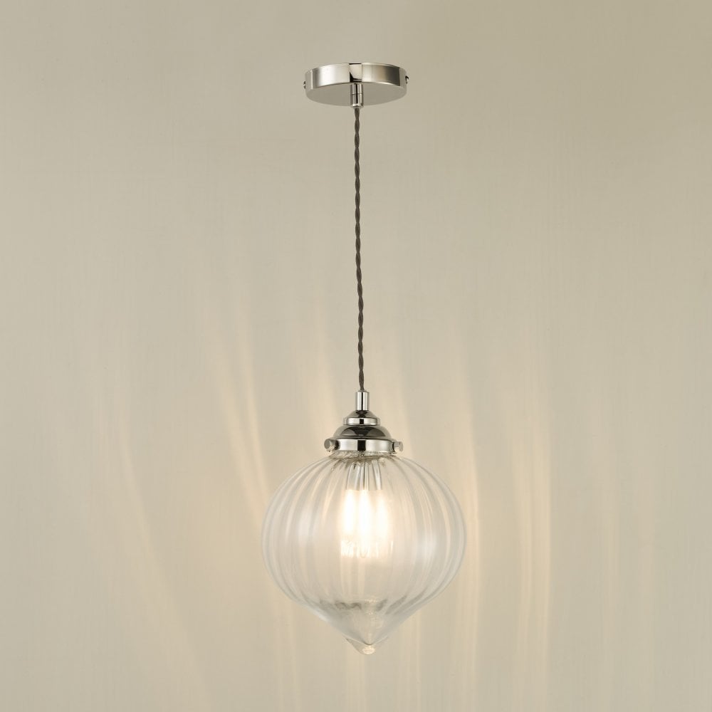 The Mya single pendant features a traditional drop shaped mouth blown glass with a more contemporary soft waterfall ribbing, gently diffusing the light. Complemented with satin nickel metal work and 1 metre of black braided cable adjustable on installation.