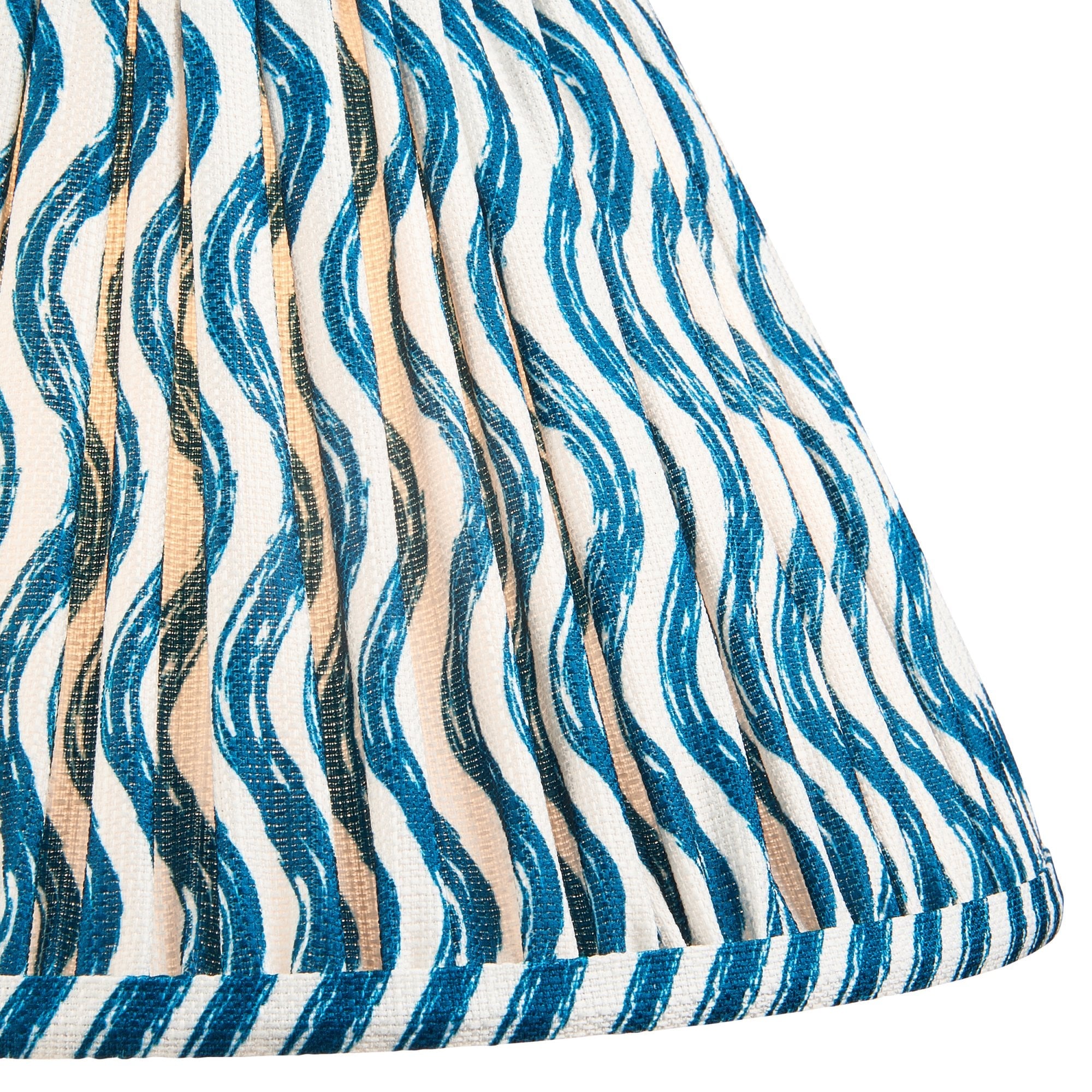 30cm tapered shade with white gimbal. Ripple pattern in marlin blue colour with taped edge detailing and plain inner lining. Perfect when paired with one of our beautifully decorative table lights.