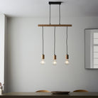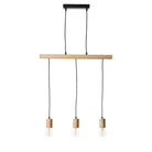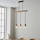 A three light linear pendant bringing the outdoors in, with natural light wood and matt black wood framing elegant filament lamps.