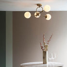 Making a nod to early Twentieth Century designs, this ceiling light features a matt antique brass finish with four opal glass shades. The structure gives the design a reassuring solidity, while the circular lights appear to float effortlessly just below the ceiling. Matching items are available.