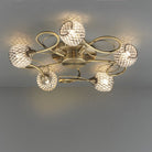 A 5 light flush ceiling fitting which comes finished in an antique brass effect plate, with mesh and clear bead shades. Suitable for use with LED lamps and fully dimmable.