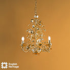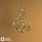 Part of the English Heritage lighting collection, inspired by Great British houses and gardens. The Audley End 3 Light Tole Chandelier, finished in hand-applied gold leaf and decorative cut crystal weaves through the intricate branches of the design. When creating a truly luxurious chandelier, our designer drew inspiration from the delicately carved and gilded state bed in the Howard Suite of Audley End House