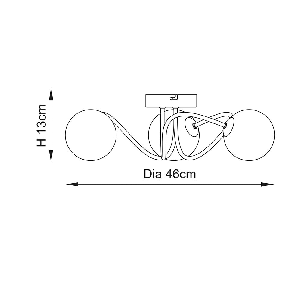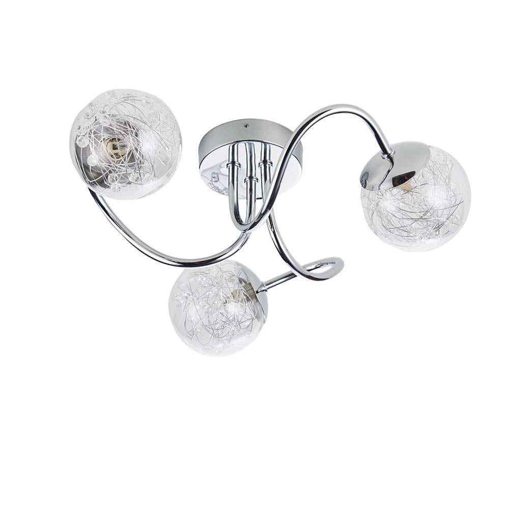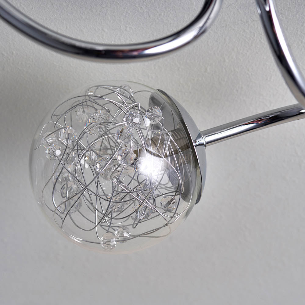 A modern style compact ceiling light with loop arms. Finished in chrome, each clear glass shade is filled with thin wire and threaded with glass beads to create a striking light pattern. Perfect for modern interiors with low ceilings and compatible with G9 LED lamps.