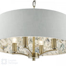 The pattern in this collection draws inspiration from wallpaper found in the entrance hall of Crowe Hall, Suffolk. With extensive archival design work done by Designers Guild, this flowing floral print has been brought back to life. It is featured here on the interior of the Delft 4-light Pendant in polished nickel with a complementing ivory linen exterior.