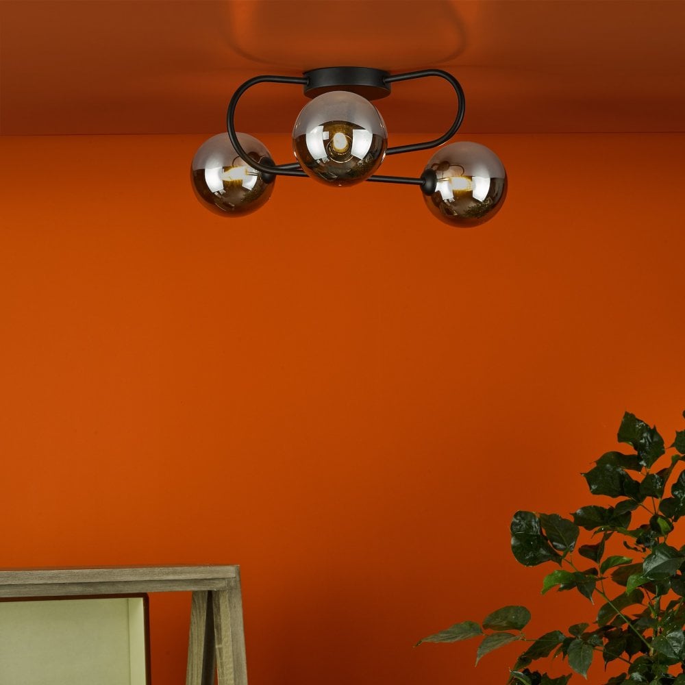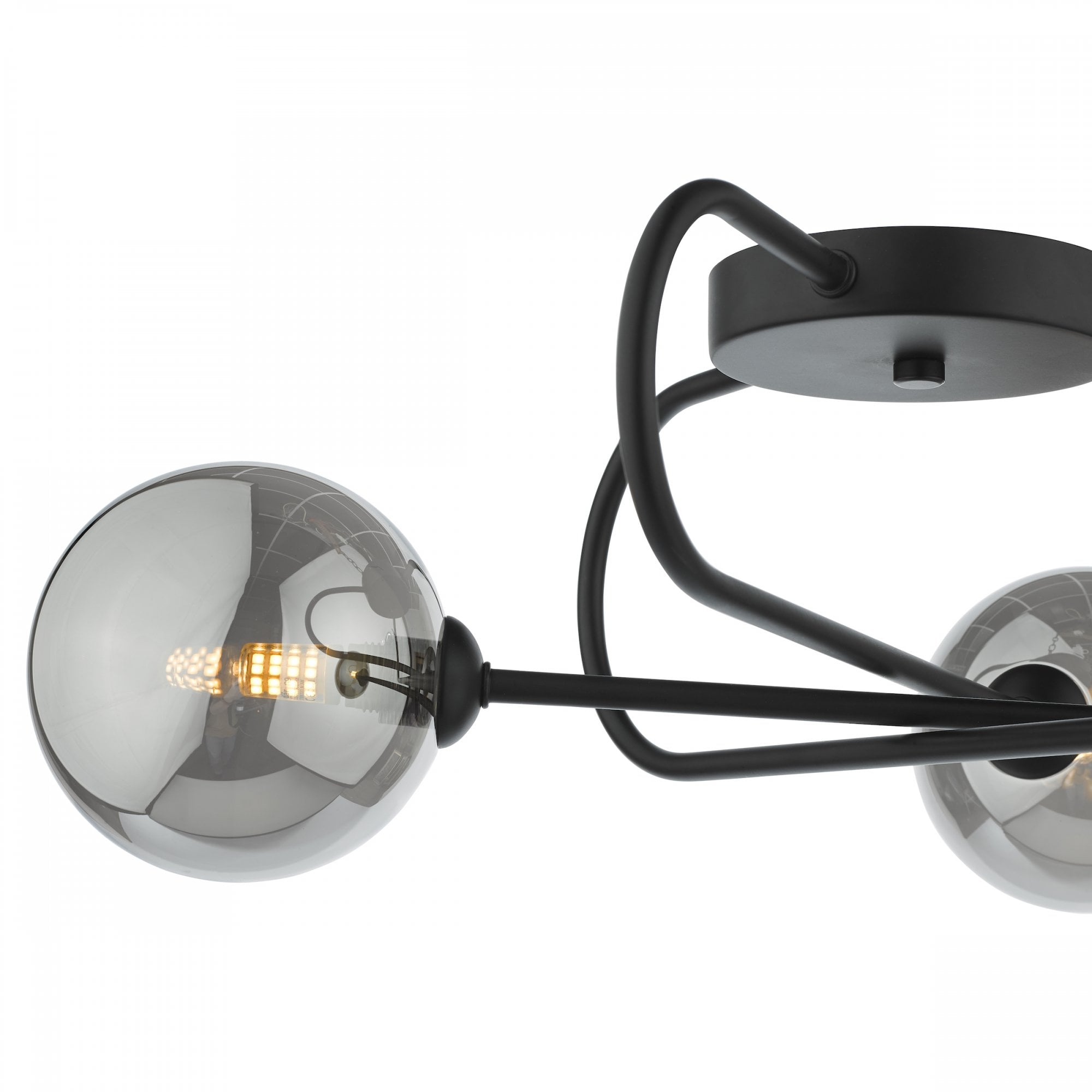 The Eisse semi-flush ceiling light in matt black with smoked glass follows the current geometric minimalist design trend with a large radius arms leading to a beautiful mirror smoked glass. The Eisse semi-flush ceiling light is part of a range including a matching wall light and table lamp.
