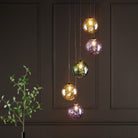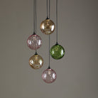 The Federico spiral cluster pendant is a minimal design in matt black with a mix of 5 spiralling oversized dimple glass shades, in pink, amber and green. We find it's minimalism so versatile and refreshing; it's just at home as a stairwell light as it is lighting a dining table or over a bed. The black fabric cable can be adjusted on installation, but if you want to go very short, you will need the help of an electrician.
