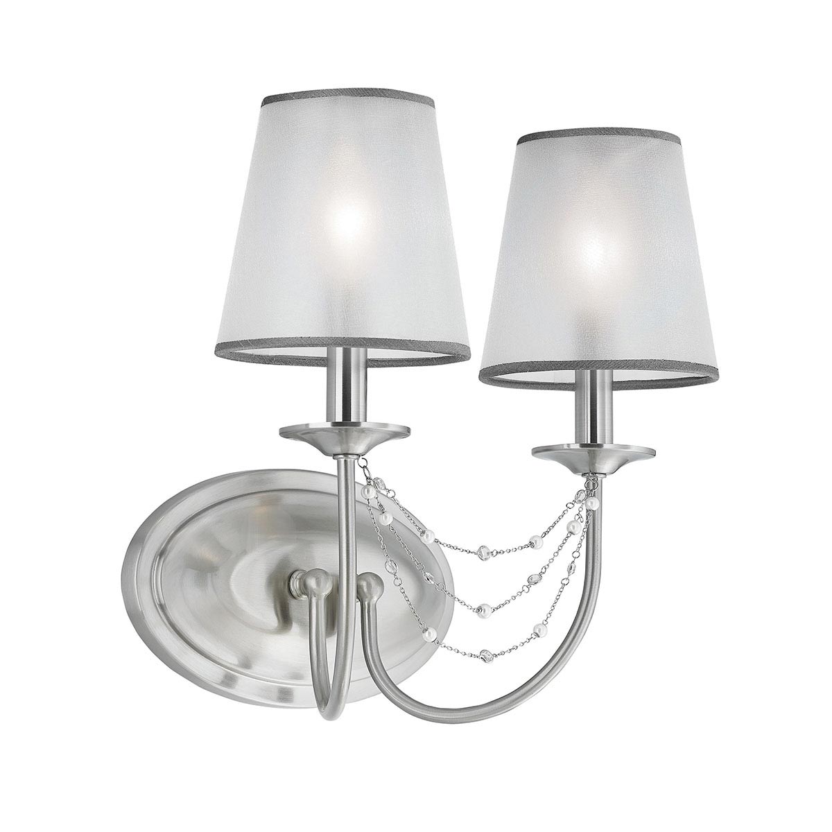 Aveline collection bring a special element to a traditional silhouette. The sweeping chains draped from arm to arm with alternating crystals and ghost pearls. The shades are made of luxurious organza with a touch of grey trim for a tailored finish.