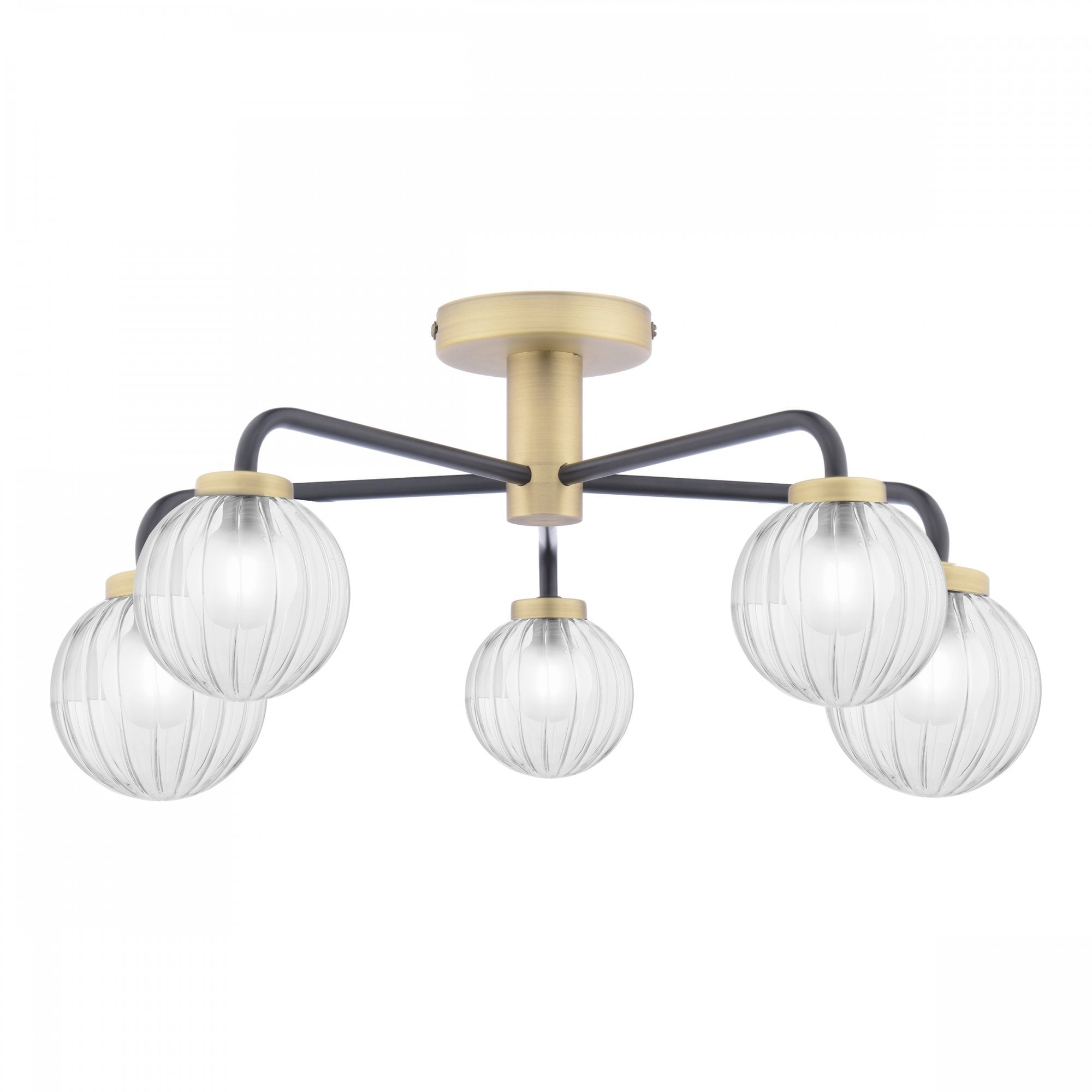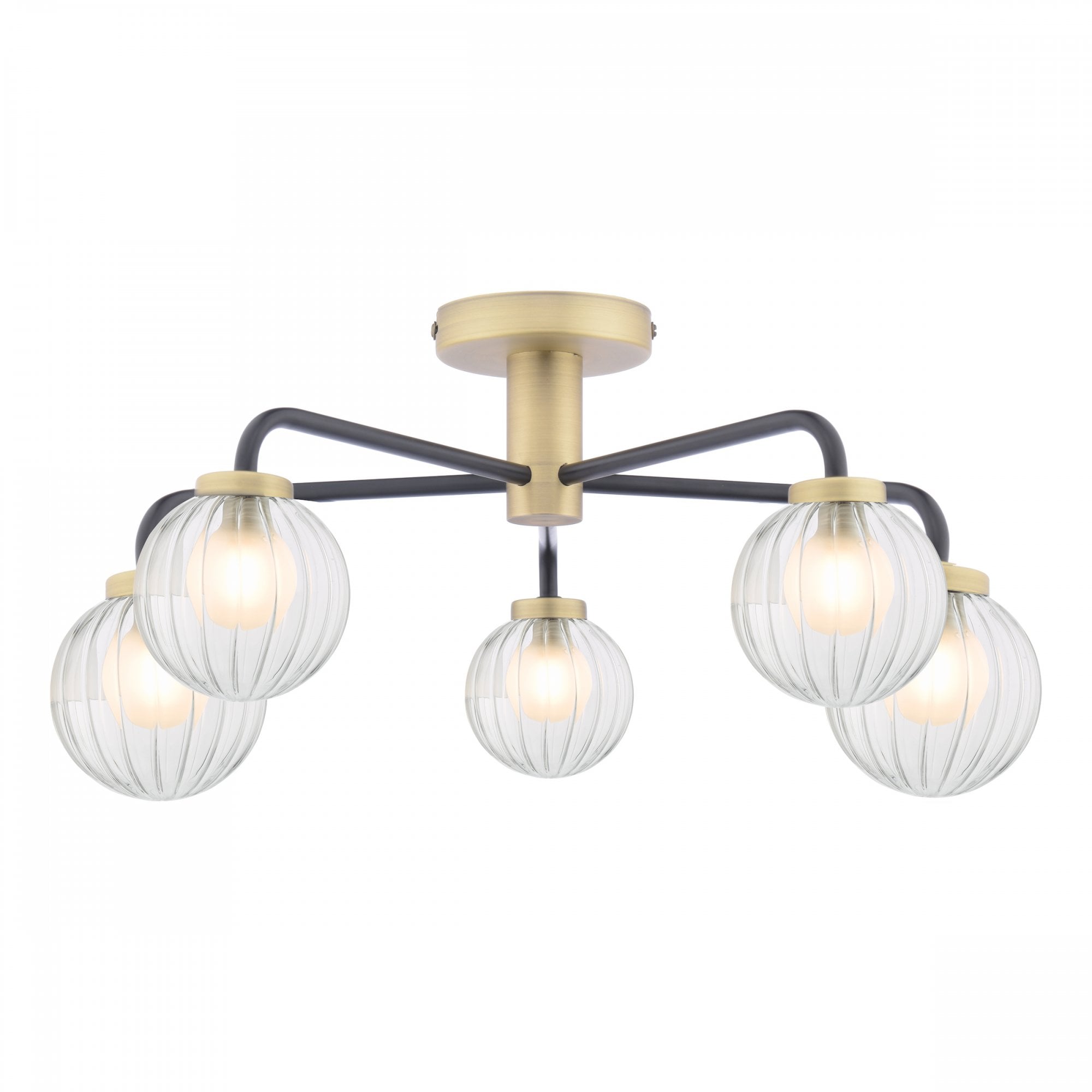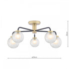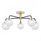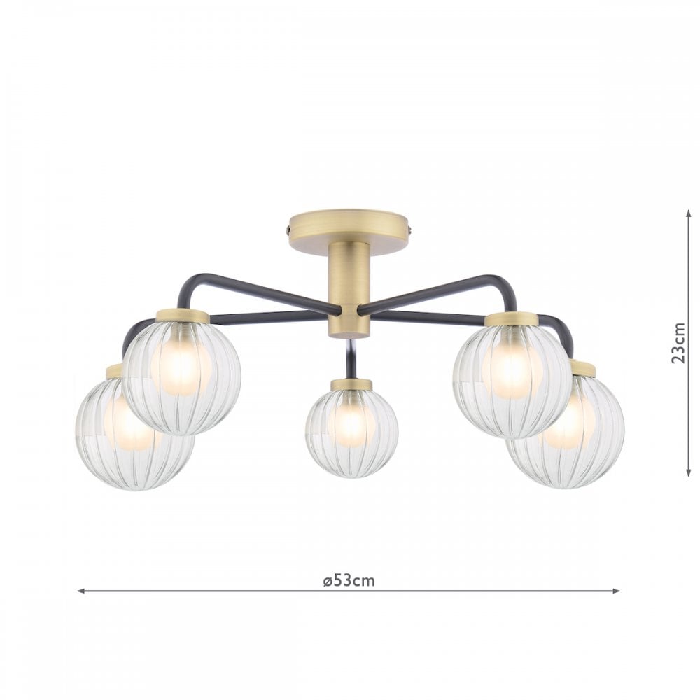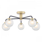 The Gibbs 5 Light Semi-Flush Antique Brass & Glass is a simple 5 light flush ceiling light in contemporary matt black with antique brass accents. The duplex glass shade features a clear ribbed glass outer with an opal inner to reduce glare, allowing light to filter through in an ambient glow. The Gibbs semi-flush is suitable for an entryway, dining room or anywhere a little style is needed.
