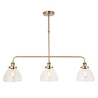 An ideal Industrial style linear pendant with adjustable height stem, great for dinning rooms and kitchens. Antique brass finished metal work with knurled details and clear glass shades.