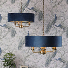 - Shade: Blue luxury velvet drum shade with a soft gold metallic inner