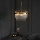 Beautiful contemporary interpretation of the pendant light in antique brass plated finish. Decorative clear glass rods diffuse the light to create an inviting ambience. The chain can be adjusted to suit ceiling height and allow it to be perfectly hung above dining tables or in living spaces.