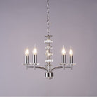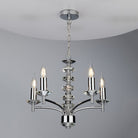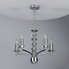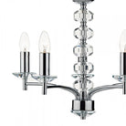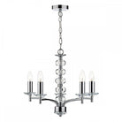 The Oleana chandelier features substantial faceted crystal glass beads stacked on a bright polished chrome frame. The finial end of this 5 armed ceiling light is also crystal.