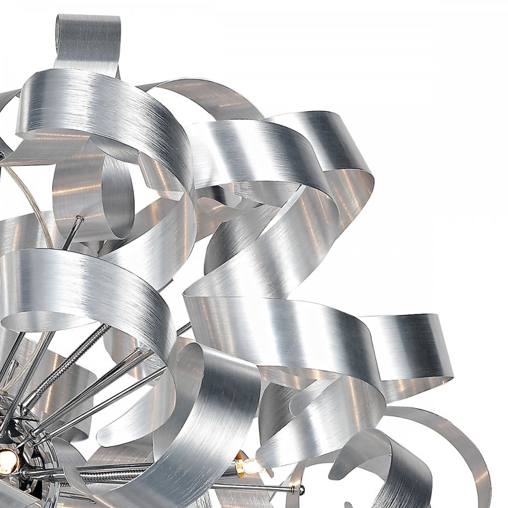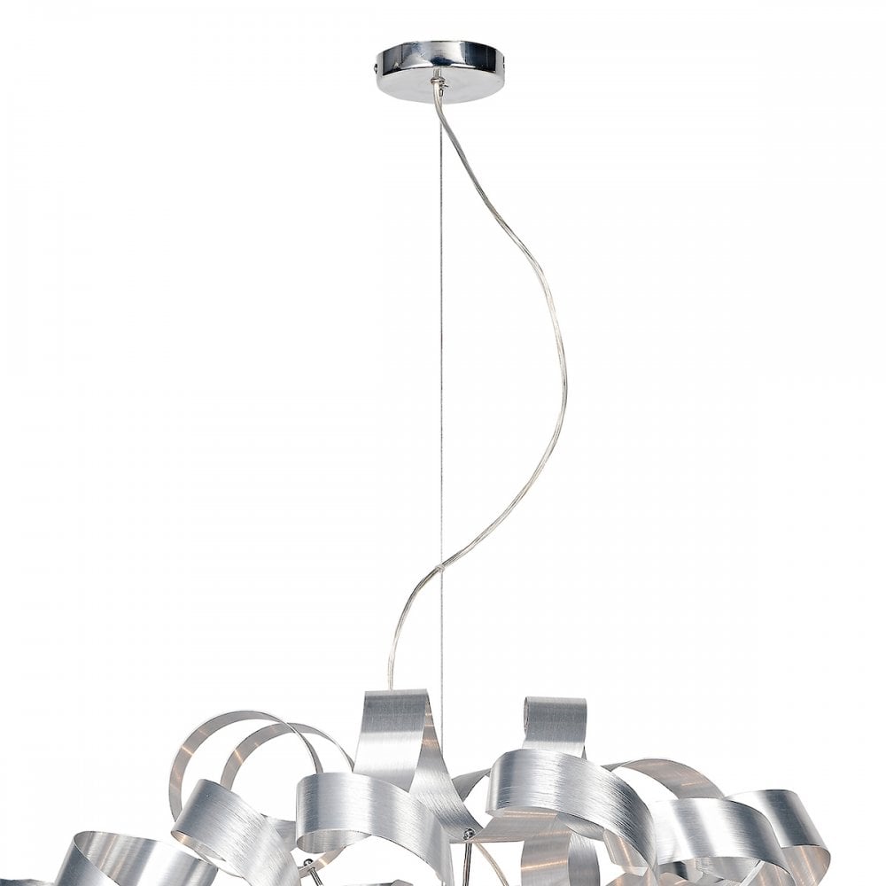 The RAWLEY 12lt Pendant features twirling ribbons of brushed aluminium around a polished chrome frame.