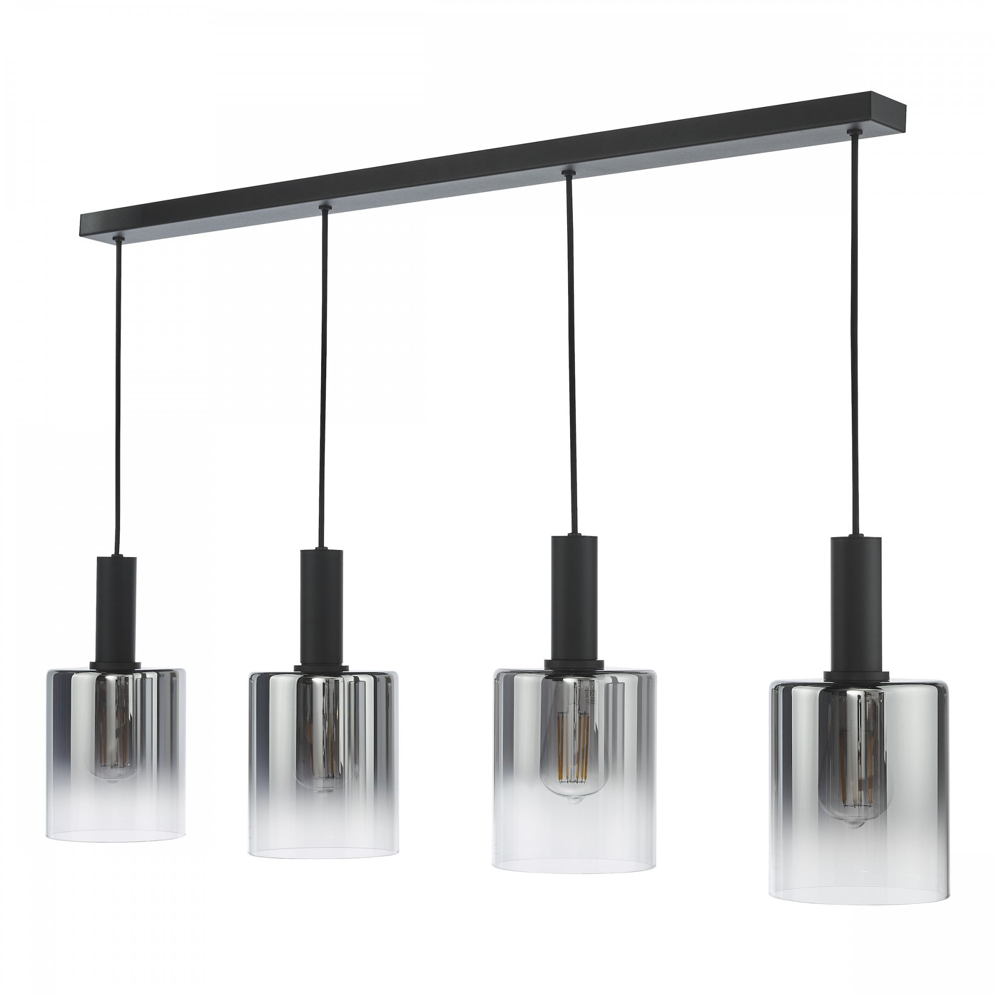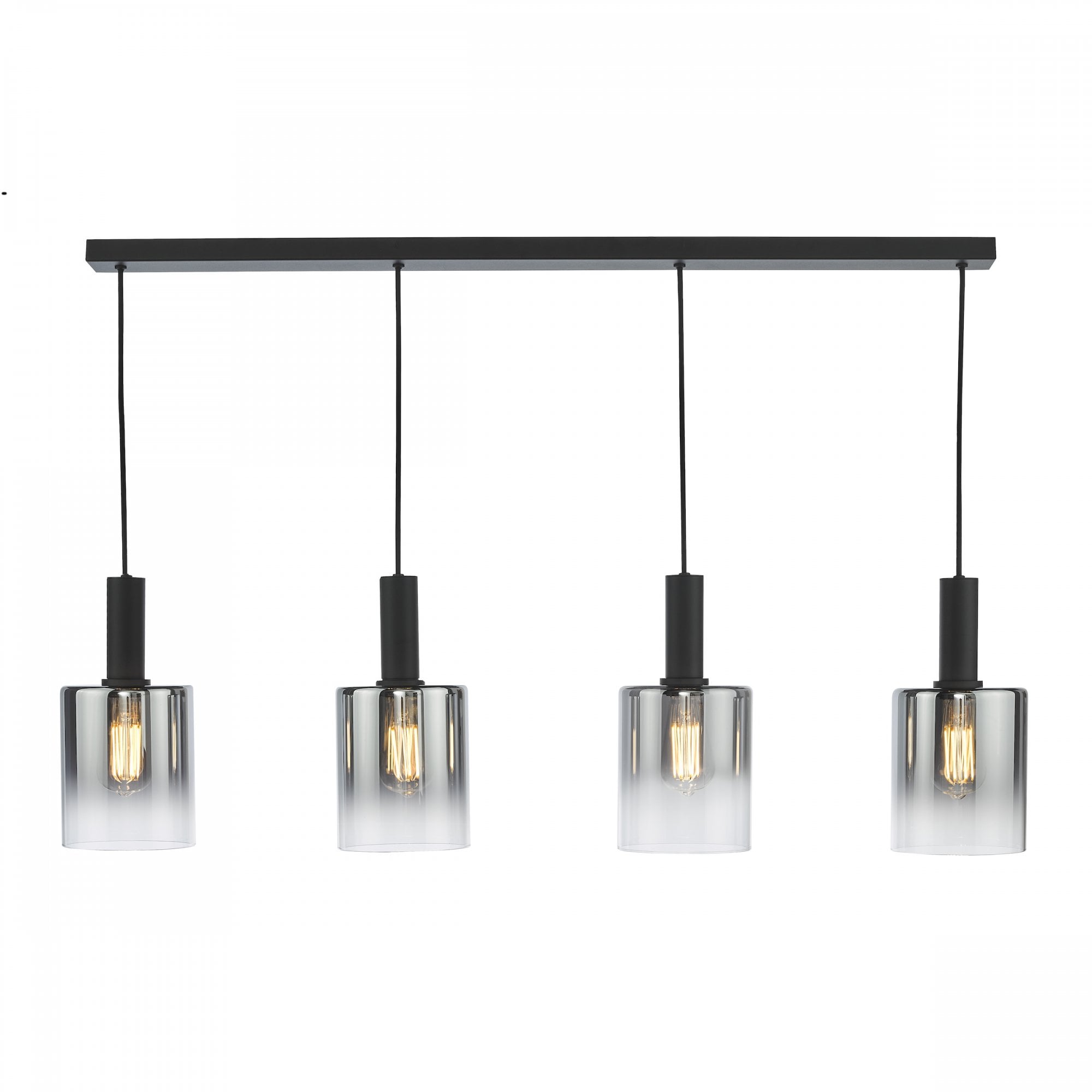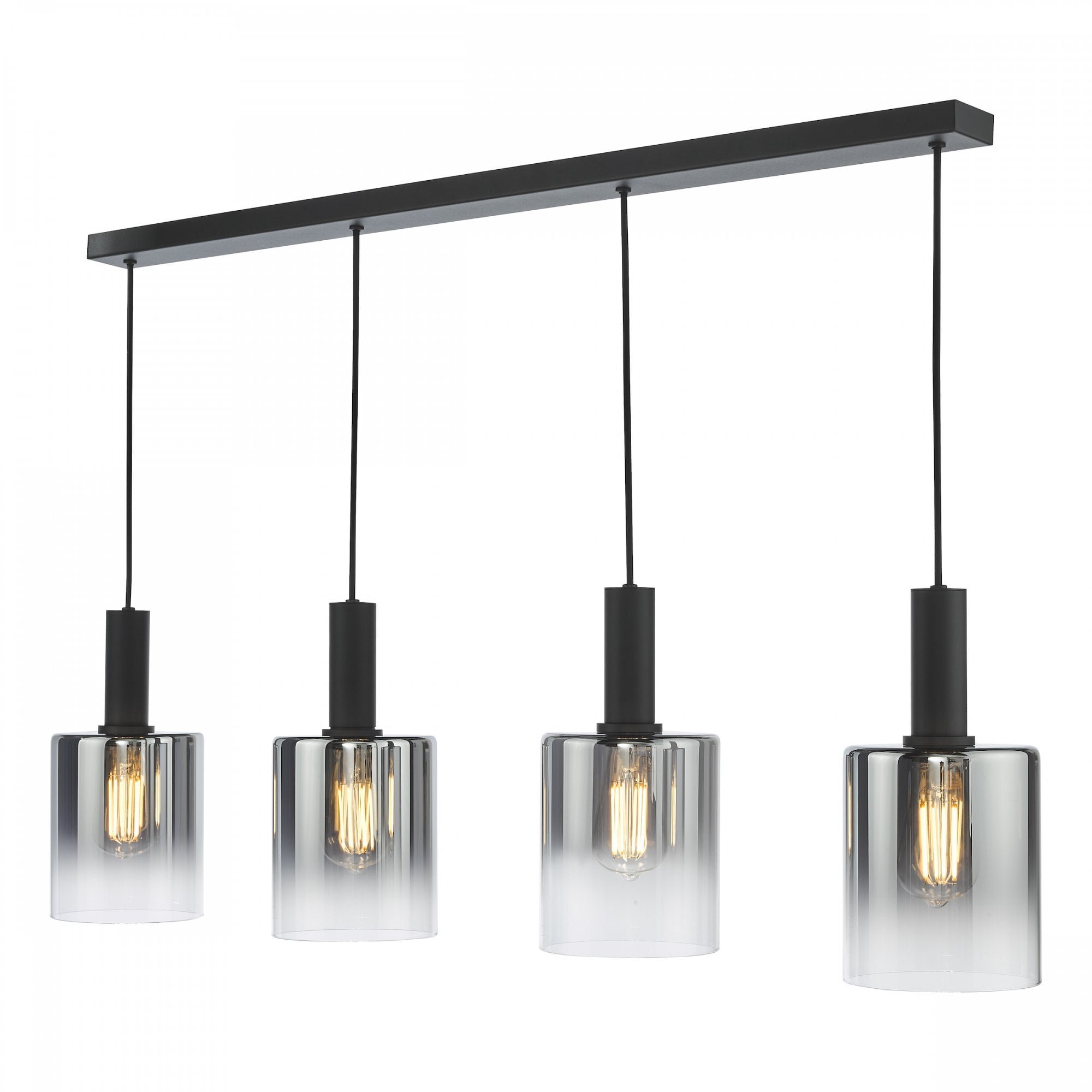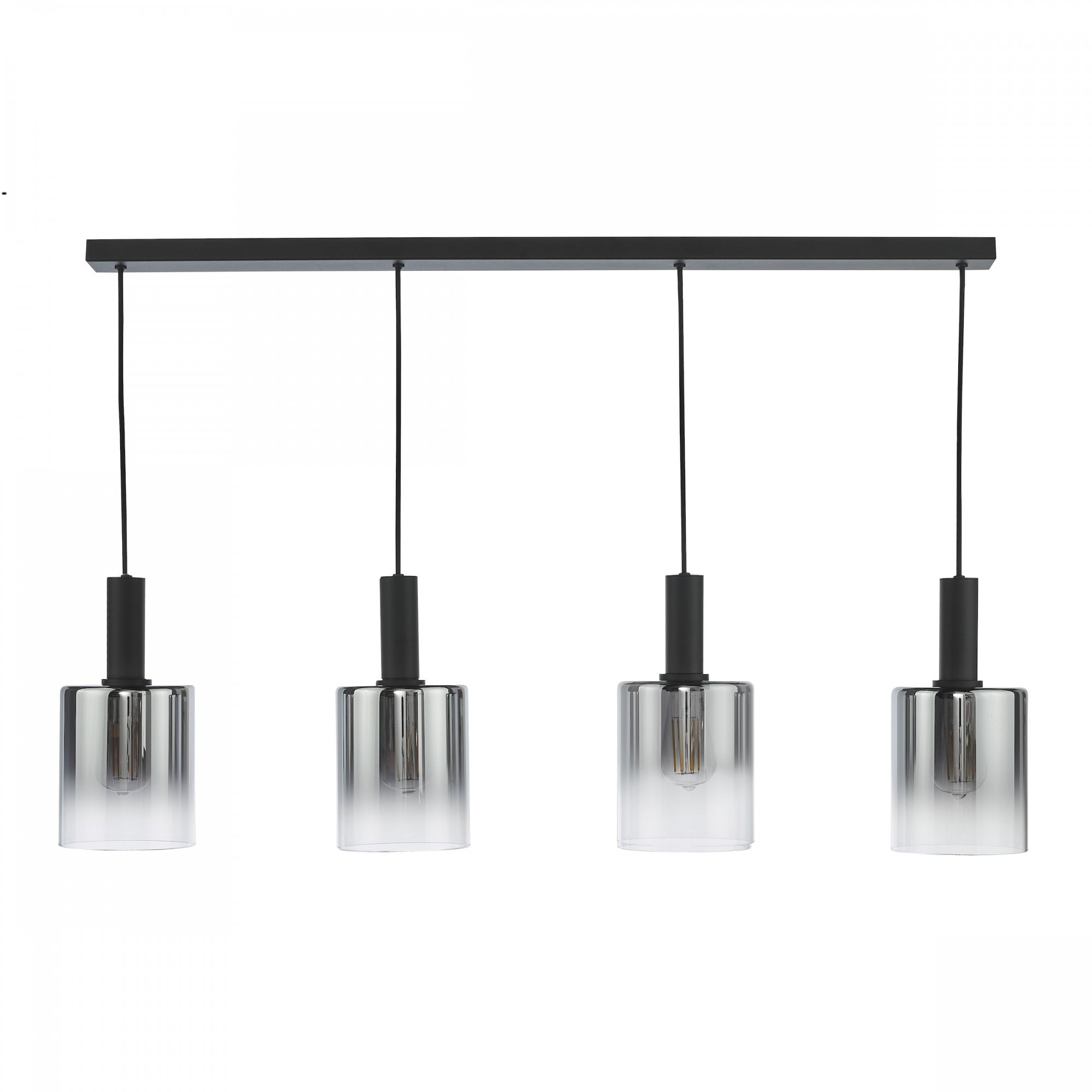 The captivating Savannah 4 Light Bar Pendant effortlessly combines contemporary design with a touch of glamour, instantly transforming any space into a stylish haven. The matt black frame beautifully contrasts with the ombre smoked glass shades, creating a visually striking aesthetic that will capture the attention of anyone who enters your home. The Savannah 4 Light Bar Pendant is perfect for illuminating larger areas such as kitchen islands or dining rooms, casting a warm and inviting glow that sets the mood for any occasion. Height is adjustable at the point of installation (33-133cm). Bulb not included, takes 4 x 40W max E27.