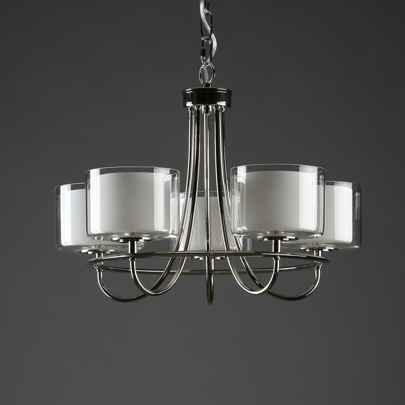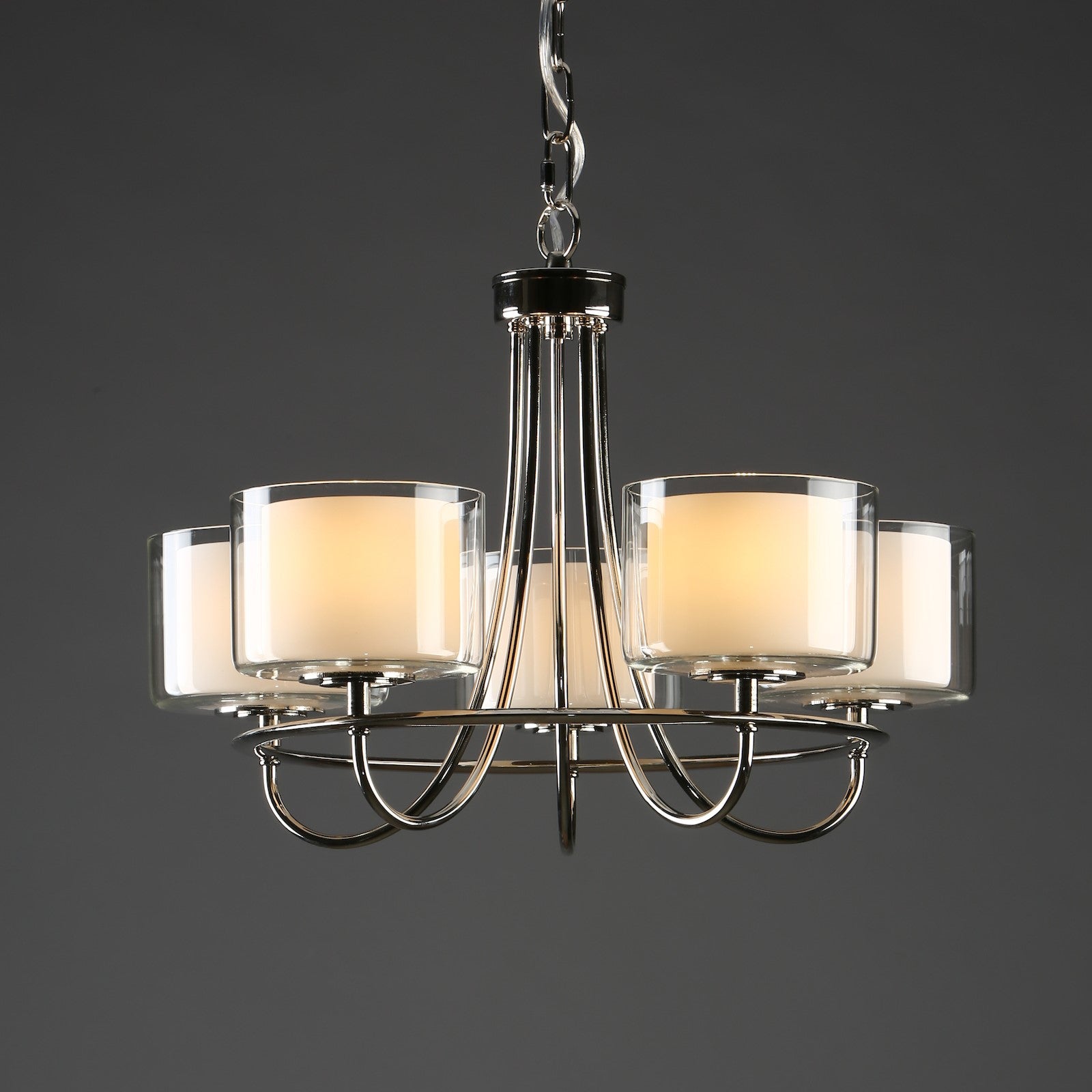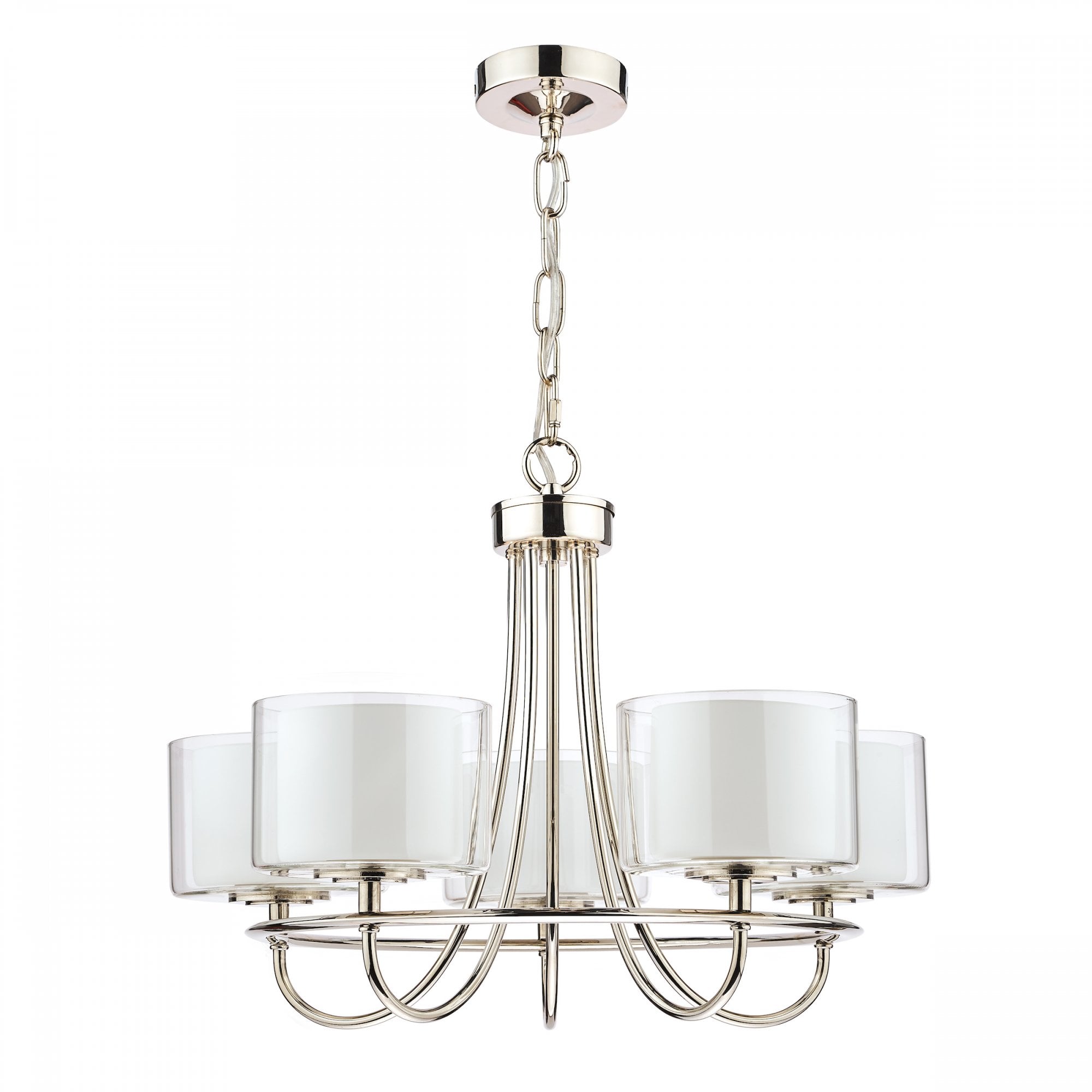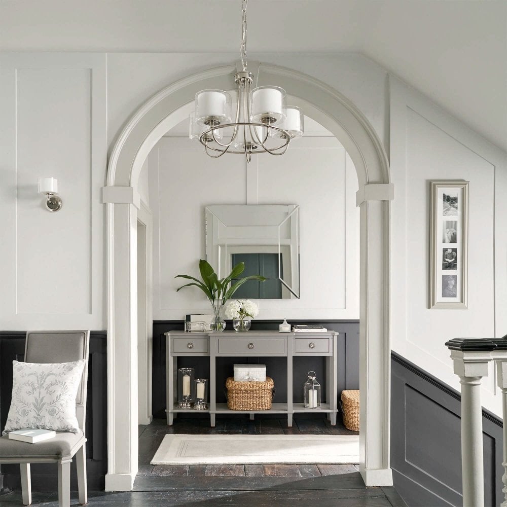 Featuring five, double-layer glass shades - clear with matt opal white inners - designed to diffuse light, and bright and beautiful polished nickel framework, the sophisticated Laura Ashley Southwell chandelier is an elegant armed pendant light that will never fail to impress. This quality 5 light ceiling fitting is designed to help you create an inviting atmosphere that you will love to unwind in as well as well as entertain.