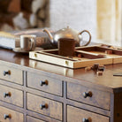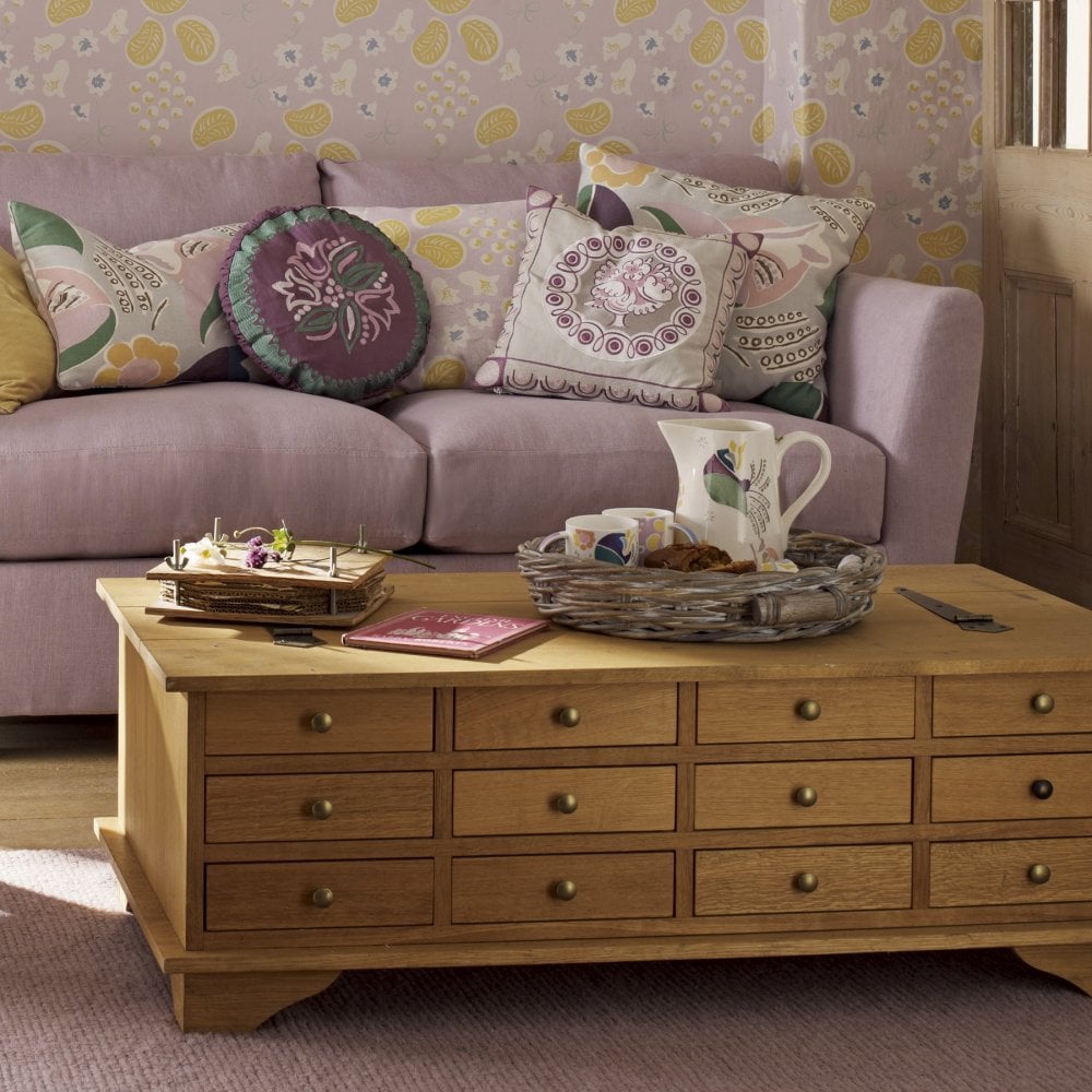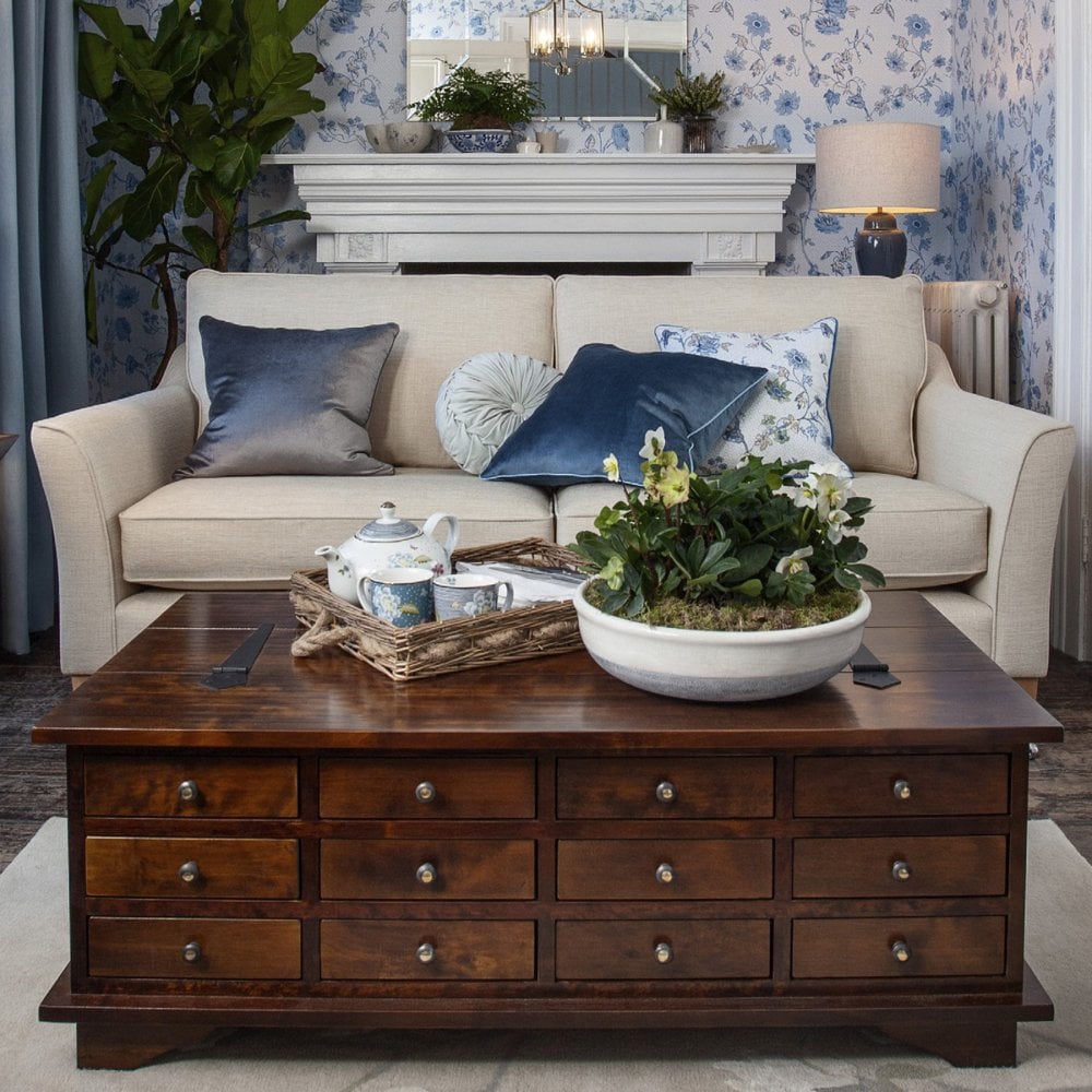 Crafted from predominantly solid birch but with some birch veneer modern materials the Laura Ashley Garrat 12 Drawer Coffee Table is a solid, well-proportioned occasional table and is strongly reminiscent of an old apothecary cabinet. It features a rippled lift up lid and there are twelve handy sized drawers. The table is stained to enhance the natural wood effects and has brass effect fittings giving it a truly authentic look.