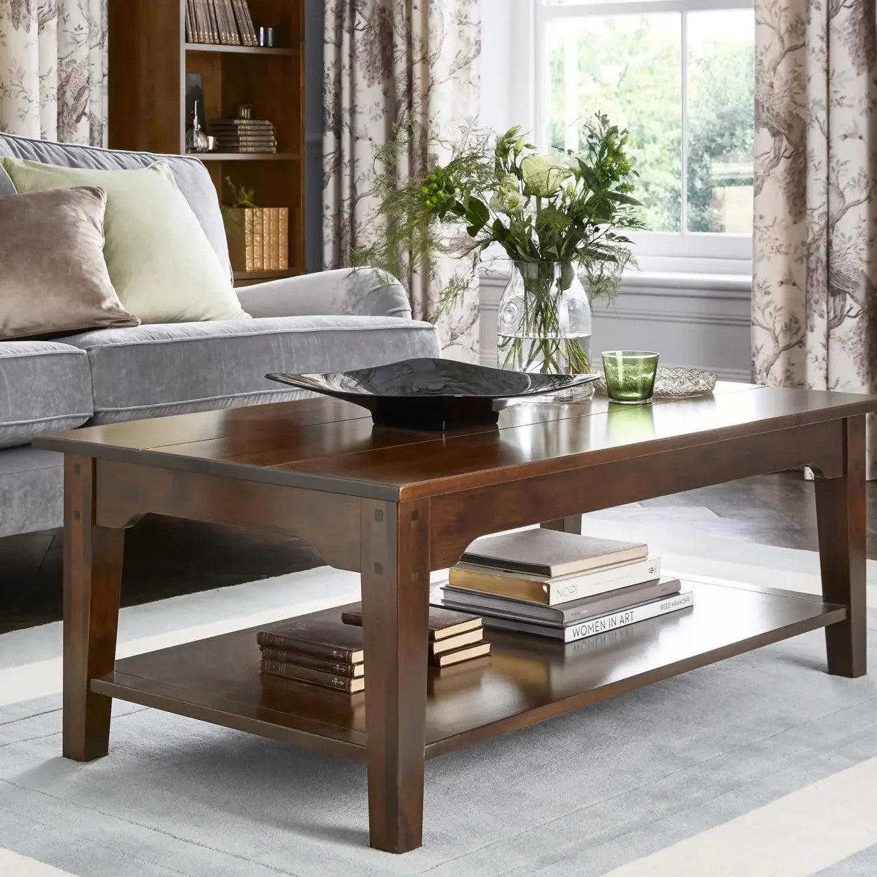 Crafted from predominantly solid birch but with some birch veneer modern materials the Laura Ashley Garrat Rectangular Coffee Table is a solid, well-proportioned occasional table. It features a smooth top and has a fixed shelf for handy storage. The table is stained to enhance the natural wood effects giving it an authentic look.