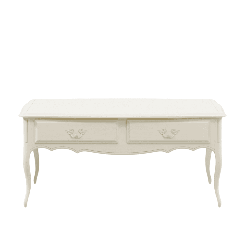 The Laura Ashley Provencale 2 Drawer Coffee Table exemplifies the beautiful proportions and intricate detailing of Rococo French furniture. The table takes centre stage with its elaborate sculpted legs and shaped aprons. It features two drawers dressed with authentic florid handles particular to the style and matching panels on the opposite side. The typical curved corners of the piece are further complemented by its inscribed details. All surfaces are finished with a durable yet unassuming paint and a delicately applied patina to selected edges and profiles.