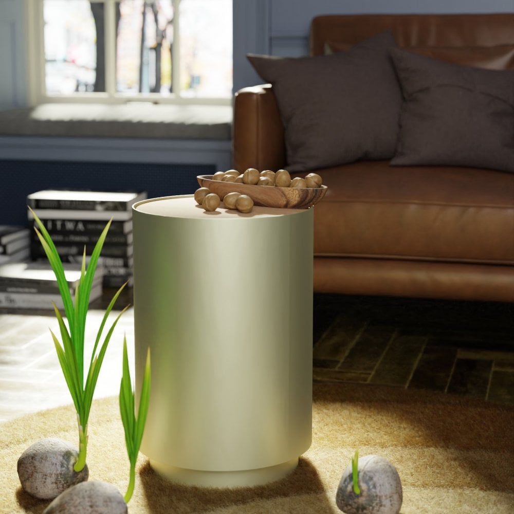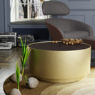 Striking in appearance the Laura Ashley Veronique Coffee Table would grace any living room setting. Crafted from solid wood and sheet metal, it is superbly versatile and offers ample deep storage in three cleverly formed compartments. Its outer is finished in a rich brushed brass colour and complemented by three dark chestnut effect lids which are easily lifted off. The drum sits atop an inset plinth giving the illusion of the piece effortlessly floating. A true statement coffee table. Requires two people to lift, Please ensure there is assistance available to meet our driver upon delivery.
