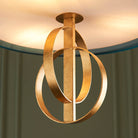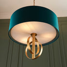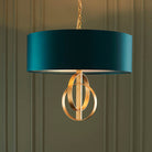 Reflecting a boutique hotel aesthetic. This pendant features two interlinked hoops and a luxurious satin drum shade. Available as a five or three light pendant in antique gold or silver leaf and with mink or teal fabric shade. Combine with matching items from the same range for a coordinated look.
