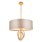 Reflecting a boutique hotel aesthetic. This pendant features two interlinked hoops and a luxurious satin drum shade. Available as a five or three light pendant in antique gold or silver leaf and with mink or teal fabric shade. Combine with matching items from the same range for a coordinated look.