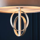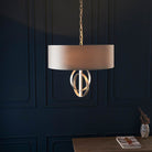Reflecting a boutique hotel aesthetic. This pendant features two interlinked hoops and a luxurious satin drum shade. Available as a five or three light pendant in antique gold or silver leaf and with mink or teal fabric shade. Combine with matching items from the same range for a coordinated look.