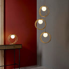 Brushed gold finish metalwork with a gloss opal spherical glass shade. Inline on/off switch with 1.5 metre light grey fabric cable. Perfect for use with G9 LED lamp.