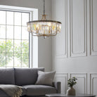 Antique brass plated metal work with decorative clear cut faceted glass that creates a striking light pattern. Height adjustable 1.5 metre chain with clear cable. Compatible with E14 LED lamps.
