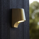 Weather resistant die cast aluminium with brushed gold painted metalwork and frosted glass diffuser.