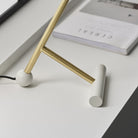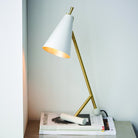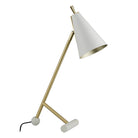 Modern architectural style task lamp featuring a satin brass plate with matt white metalwork. This task lamp has a fully adjustable head and an inline on/off switch and 1.5 metre black fabric flex to plug.