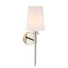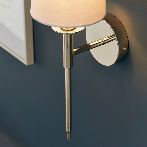 Bright nickel plated metal work with vintage white cotton mix fabric shade. Perfect for use with E14 LED lamps.