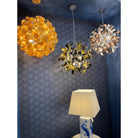 The Anya 6 light wooden pendant Is constructed from real ash veneer onto a sputnik like metal frame, creating what seems like an explosion of soft wood swirls. The Anya ceiling pendant looks great off but the thin wood veneer shows it’s natural translucence when lit.
