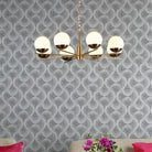The 8 light bombazine ceiling pendant is inspired by mid century atomic design. This design era was heavily inspired by the space race. This design features a flat sputnik light structure with oversized opal glass shades perching on fine radiating arms. The bombazine 8 light pendant has a large diameter, but the height is quite shallow, meaning it can be placed where ceilings aren’t so high, equally it comes with 1 metre of chain allow it to be adjusted to suit your room on installation.