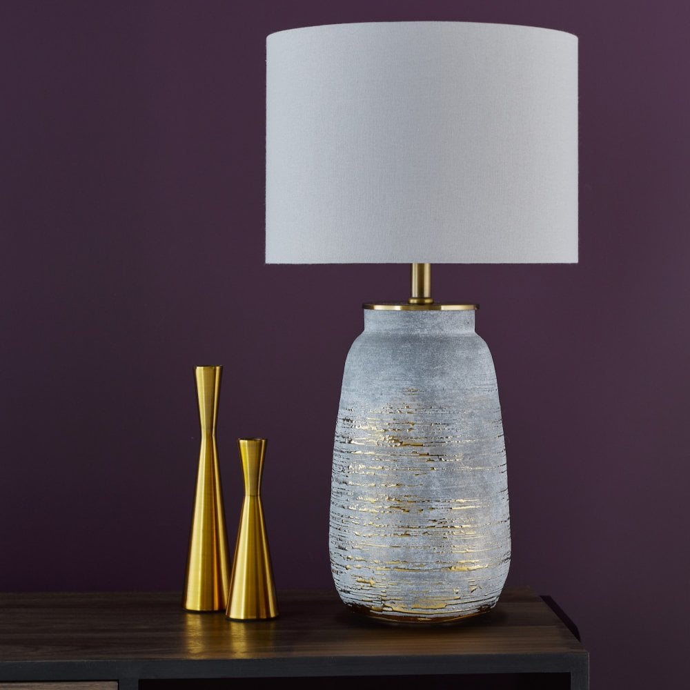 Bring a touch of industrial chic to your space with the Creon Table Lamp. This stylish grey Table Lamp base boasts a concrete-effect ceramic finish with a subtle metallic gold brush glaze, perfectly complemented by antique brass details. The result? A sophisticated concrete Table Lamp that's anything but cold. Customise your look by pairing it with one of our shades or use your own for a personalised touch. The Creon Table Lamp offers both style and convenience, featuring an inline rocker switch for easy operation. Whether you're after a statement piece for your living room or a bedside companion, this versatile lamp base is sure to impress with its blend of raw textures and warm metallic accents.