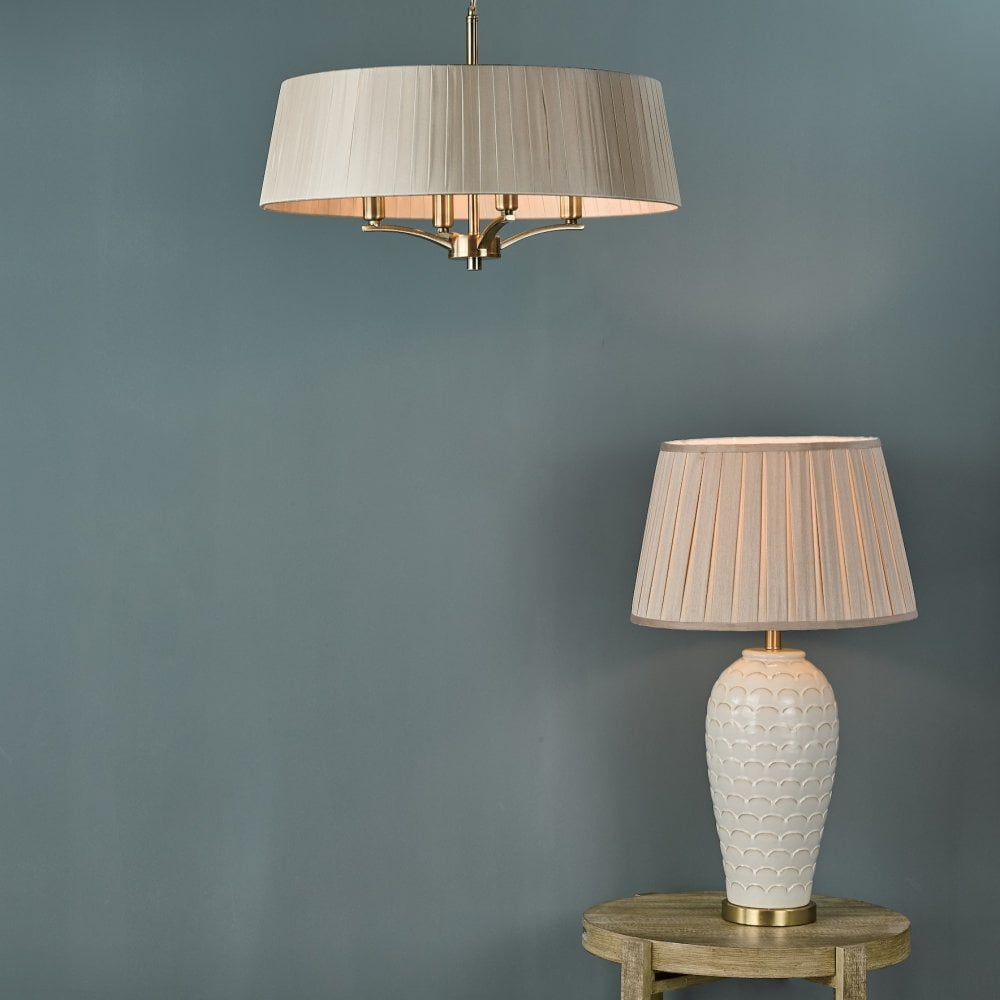 The Cristin Pendant CRI0429 is a decorative shaded pendant in an antique brass finish complete with a taupe ribbon shade. This pendant would look fabulous in any modern living space. Available in a polished nickel finish with an ivory shade. Matching wall light also available.