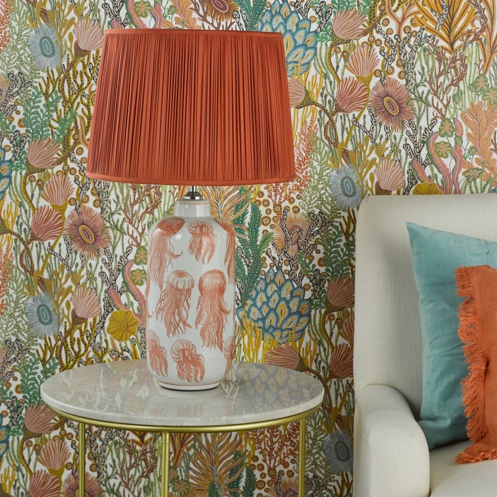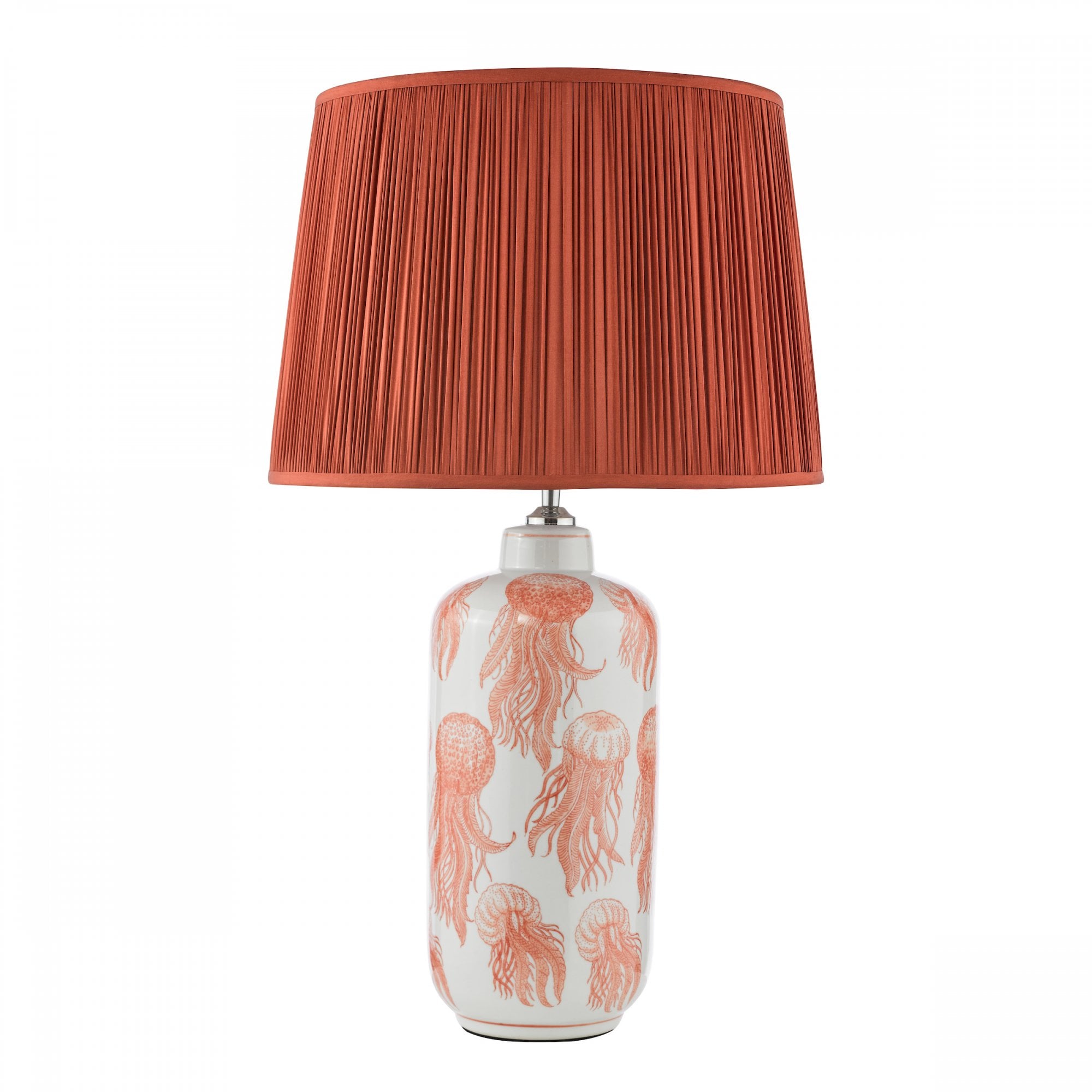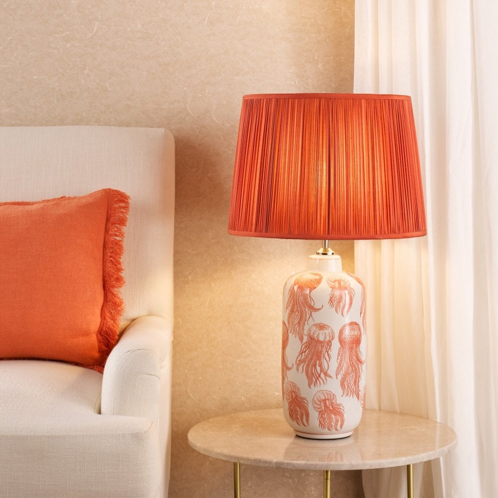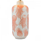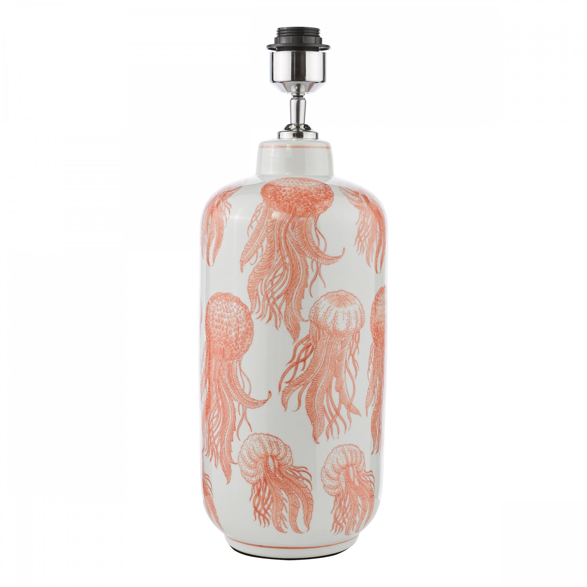 Dive into tranquil oceanic vibes with the Cyanea Table Lamp. This ceramic lamp features mesmerising coral pink jellyfish gracefully floating on a pristine white background, hand-finished with a lustrous gloss glaze. The satin chrome accents add a touch of sophistication, making it a captivating centrepiece for any room. Sold as a base only, this versatile table lamp invites you to unleash your creativity - pair it with a shade from our collection or showcase your personal style with your own. With its inline rocker switch, this jellyfish-inspired masterpiece isn't just a lamp; it's an artistic statement that brings the serene beauty of the deep sea into your home.