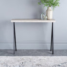 The versatile DATA console table is ideal for small rooms and hallways thanks to its narrow depth. Featuring a light grey marble effect finish with black metal legs.
